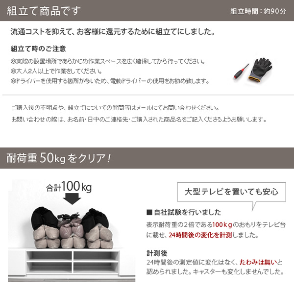 背面収納テレビ台 ステラ 幅180cm ■サイズ:幅180x奥行39.5x高さ30.5cm・約30kg ■カラー:ホワイト ■材質:本体-プリント紙化粧パーティクルボード、木口-PVC貼り、前板-合成樹脂化粧繊維板 ■お客様組立品 ※お客様組立て品につきましては、組み立て後に不良の連絡をされても対応ができません。 組み立て前にパーツに不良・傷等がないか、必ずご確認下さいます様よろしくお願い申し上げます。 ※記載は商品仕様の一部です。仕様説明不足等の理由での返品はできません。特に適合等は必ずご確認ください。
