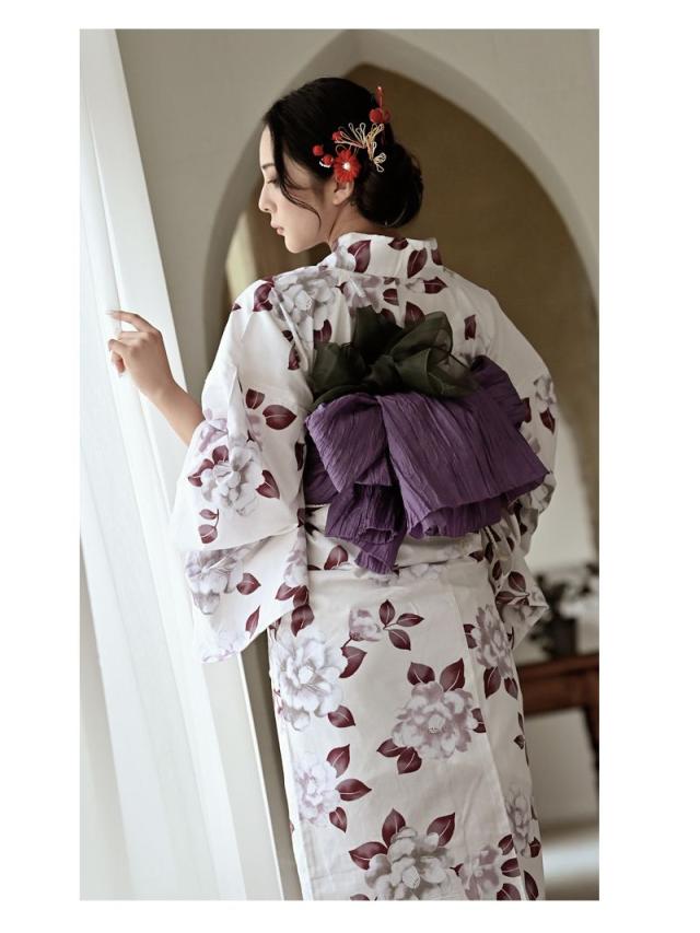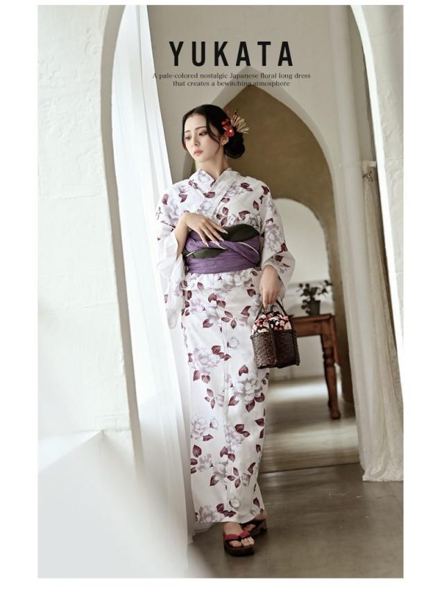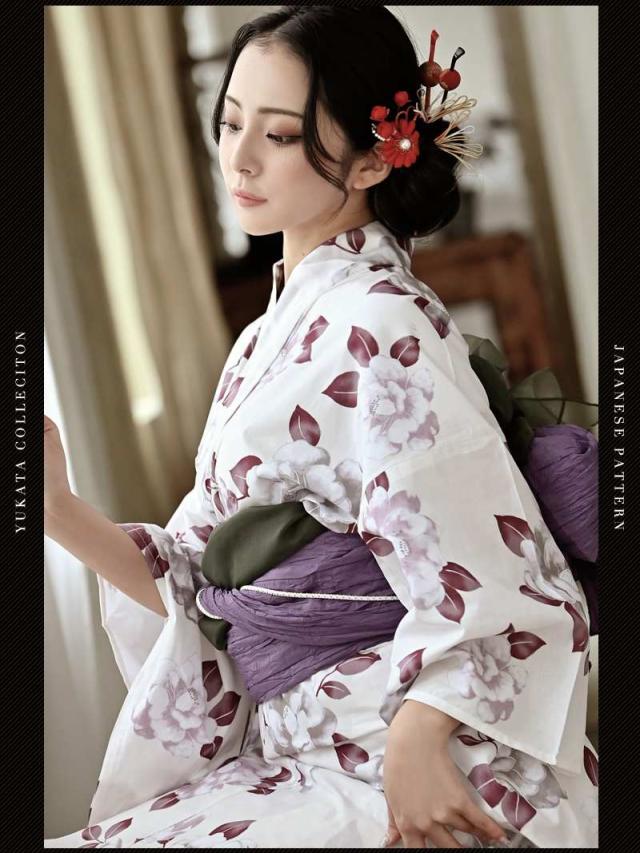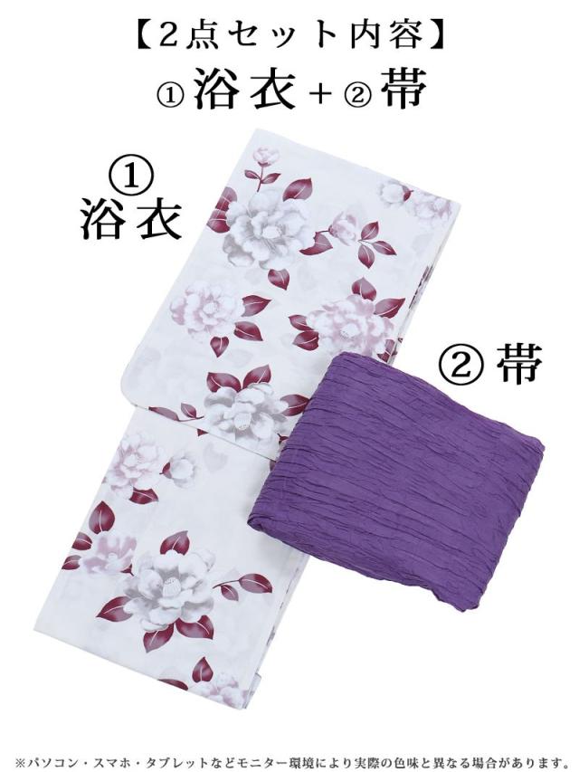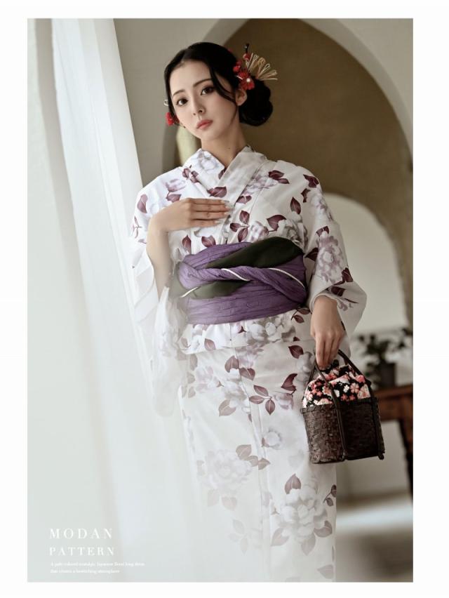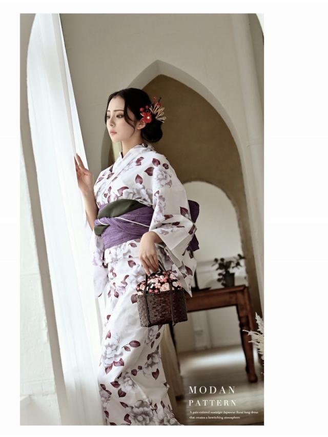 ☆ホワイトベースにパープルのレトロ感ある牡丹柄が大人女性にも上品に着こなしていただける高級感あるレディース浴衣セット♪