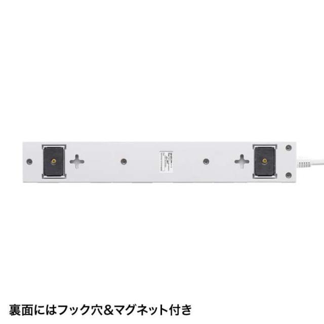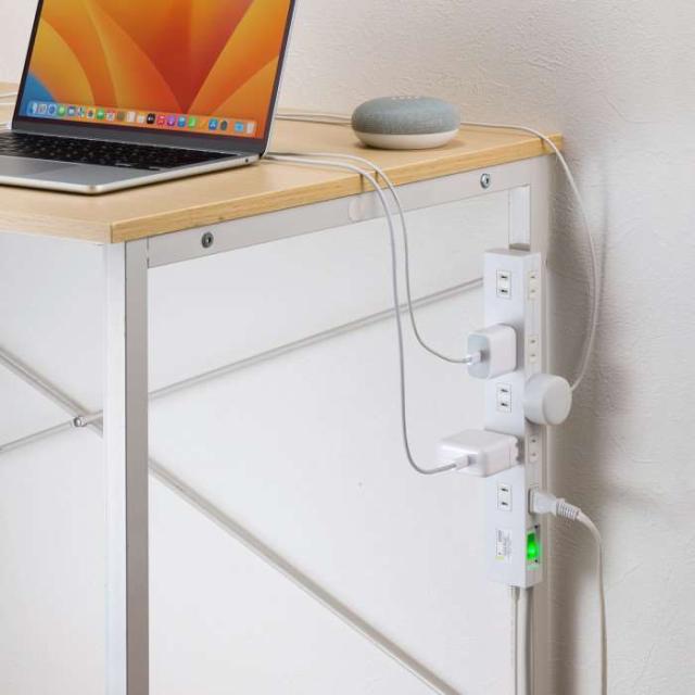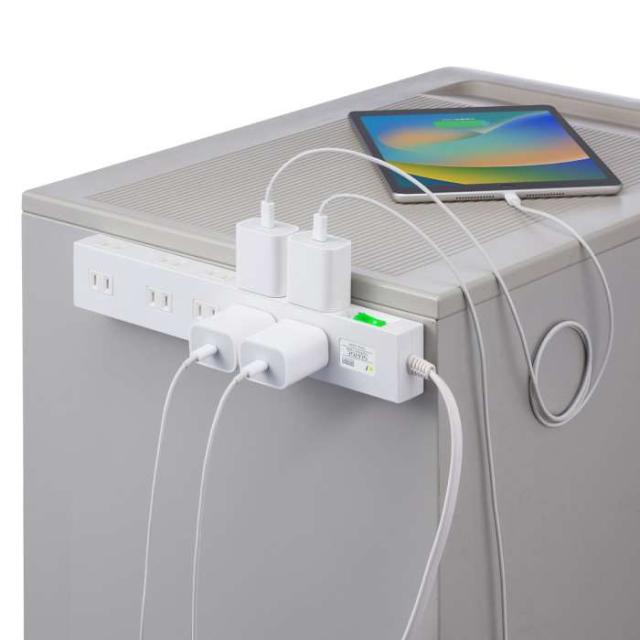 ●小型ACアダプタが差し込める(差込口ピッチ45mm)10個口電源タップ。iPadなどのタブレットの充電器接続に便利です。●雷ガードを内蔵しており、恐ろしい雷から機器をガードします。雷ガード作動中確認ランプ付きです。●一括集中スイッチ付きで、接続した機器の電源をまとめてON/OFFできます。●ブレーカーを内蔵しており、許容量をオーバーした場合ブレーカーが作動し事故を防止します。●スチール机に仮固定できるマグネット付きです。●差込口にはシャッターが付いていますので、異物混入やホコリ防止にも役立ちます。【ブレーカー作動時間について】 接続している機器の消費電力の合計が1500Wを超えた場合、ブレーカーが作動し電源が切れます。 *注意 消費電力が1500Wを超えても、すぐに電源は切れません。 オーバーした消費電力の%によって、ブレーカーが作動するまでの時間は異なります。 135%オーバー時(2025W)約1時間 200%オーバー時(3000W)約4〜50秒 300%オーバー時(4500W)約0.8〜12秒 500%オーバー時(7500W)約0.3〜4秒 *室温25℃の場合 <ブレーカーが作動した場合> 一度接続した機器をタップから外し、1500W以下になるように機器を取り除き、 リセットボタンを押して再度お使いください。