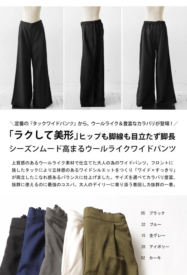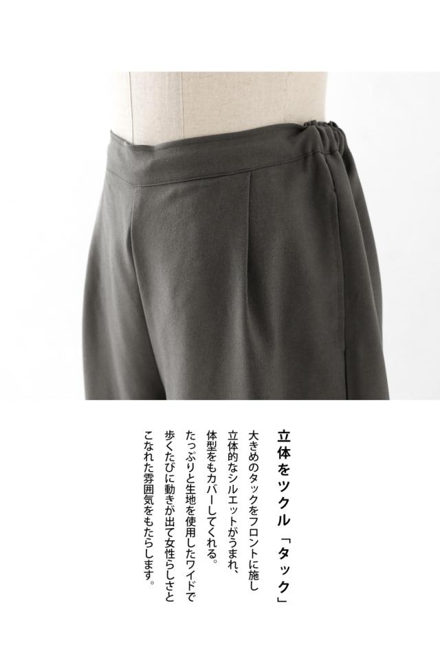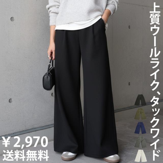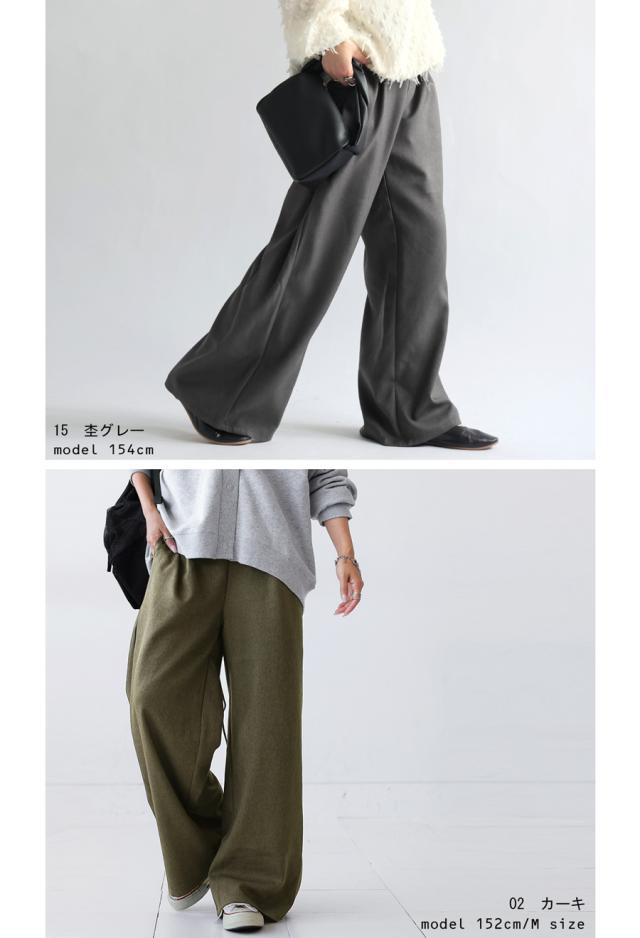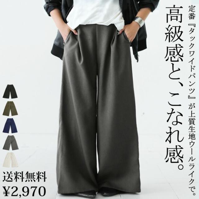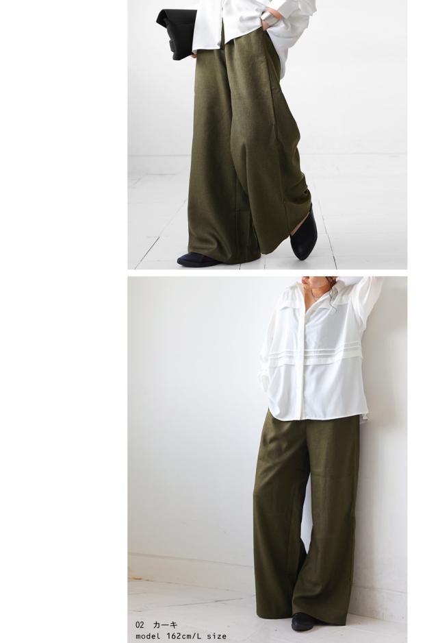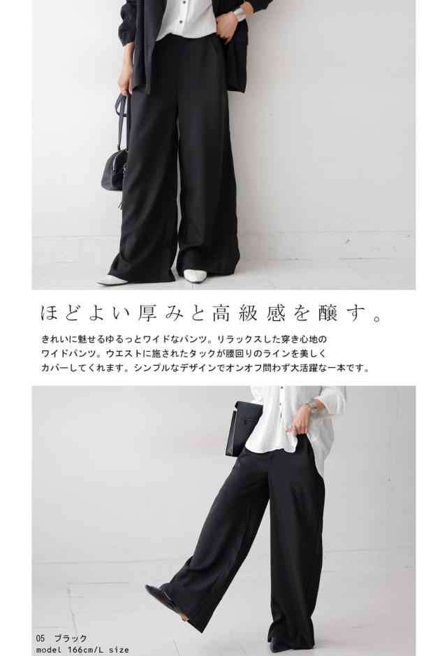 la-00026 ワイド ゆったり 長ズボン シンプル きれいめ タック タックパンツ 前フラット 後ろゴム 細見え 体型カバー モード ウールライク 大きめ 大きいサイズ サイズ展開 M L
