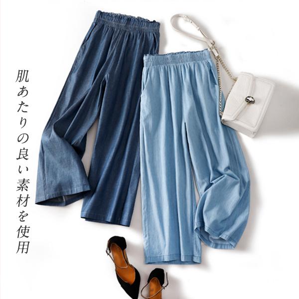送料無料!ワイドパンツ レディース ガウチョ コットン100% ルームウェア ウエストゴム デニム タックパンツ ゆったり 美ライン 自宅 楽ちん