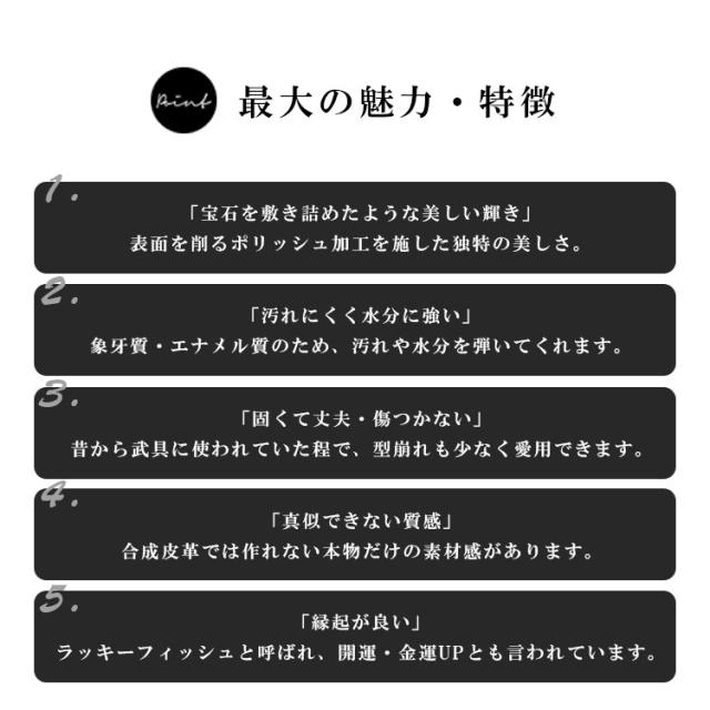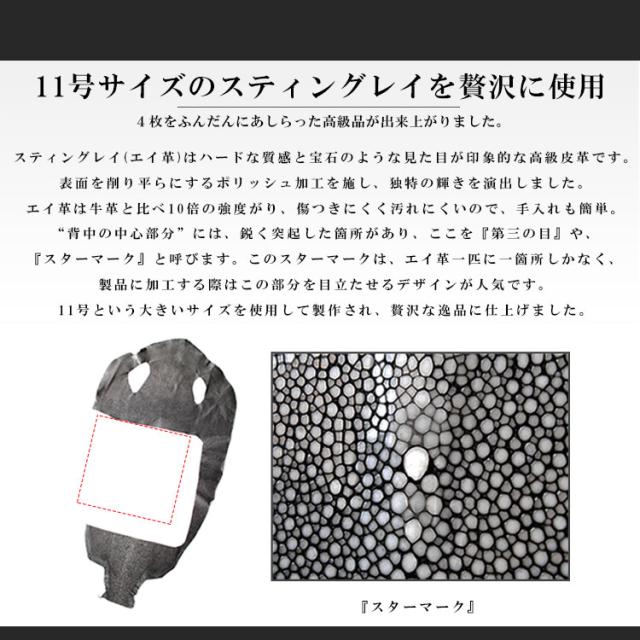 海の宝石と言われる高級素材エイ皮を全面に使用したトートバッグです。表面を削り平らにすることで輝きを出すポリッシュ加工を施してあり、宝石を敷き詰めたような輝きを演出します。エイ1匹に1部位しか取れない背中の突起部分を表裏に3部位ずつ贅沢に使用していることで独特のデザインに仕上がっています。