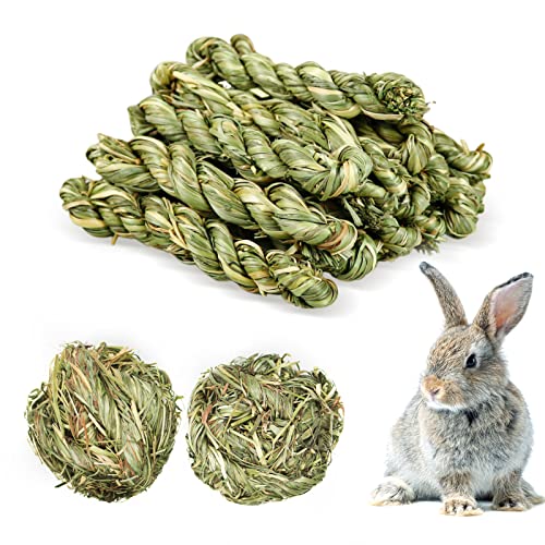 ・??天然のチモシー草:12点セット入り、チモシー草の編み縄10個、チモシー草のボール2個。天然のチモシー草を厳選し、手作りで作られており、無添加無着色なので、それはあなたのペットにより多くの繊維をもたらします。これらの高繊維?むおもちゃは、ウサギや他の小動物の歯の健康な成長に非常に適しています。ペットの健康とおもちゃが噛まれることを心配しないでください。