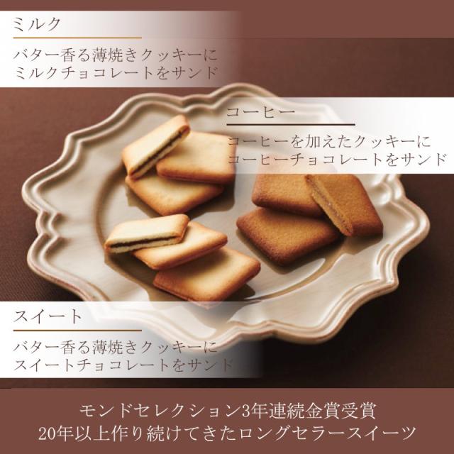 【商品について】サクッとしたラングドシャクッキーでなめらかなチョコレートクリームをサンドしました。サクッとしたラングドシャクッキーでなめらかなチョコレートクリームをサンドしました。チョコレートクリームはスイート、ミルク、コーヒーの3種類をお楽しみください。