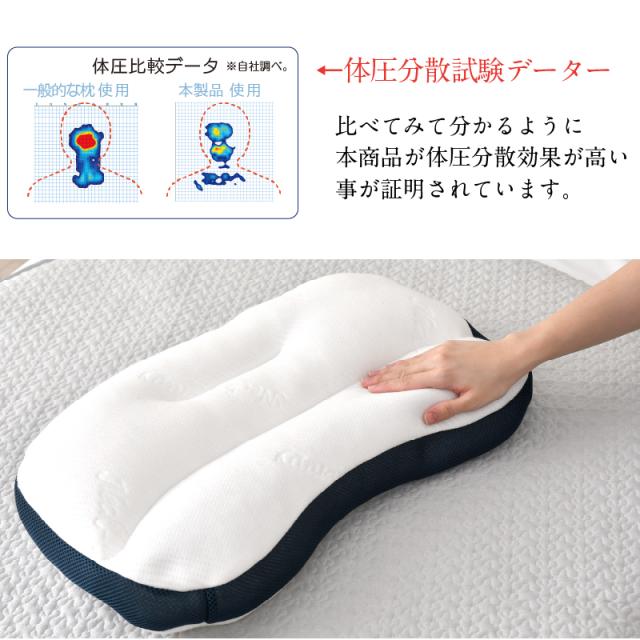 【頭をやさしく包み込み頭にかかる圧を分散し、頸椎をしっかり支え理想の寝姿勢に!頸椎を安定させ、頭をやさしく支える為、 首部分に異なる2種の素材パイプ・わたを採用!!】