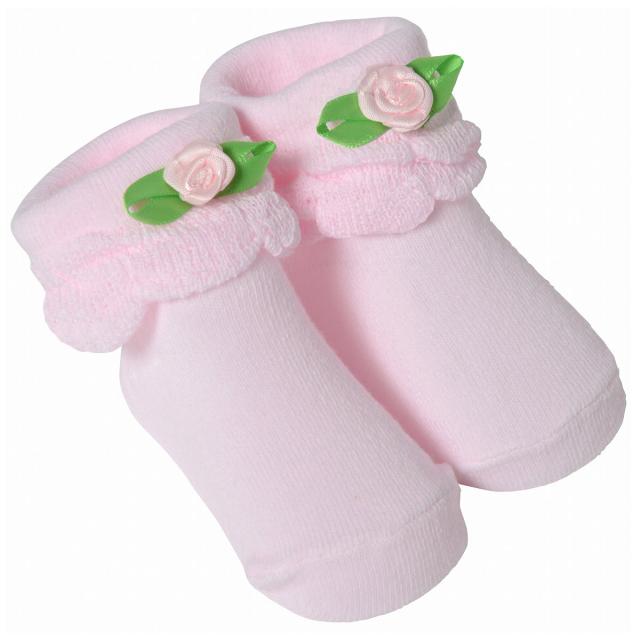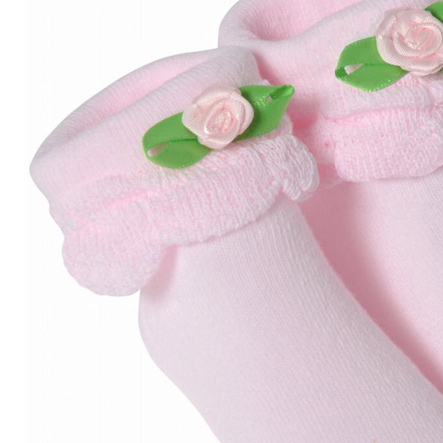小さな薔薇のリボンとフリルのような折り返しが可愛らしいデザインです。洋服と合わせてお洒落なコーディネートをお楽しみいただけます。丁寧に一つ一つこだわって縫製された日本製です。ふわっと柔らかく、国産ならではの優しい履き心地で大切な赤ちゃんの足先を守ります。