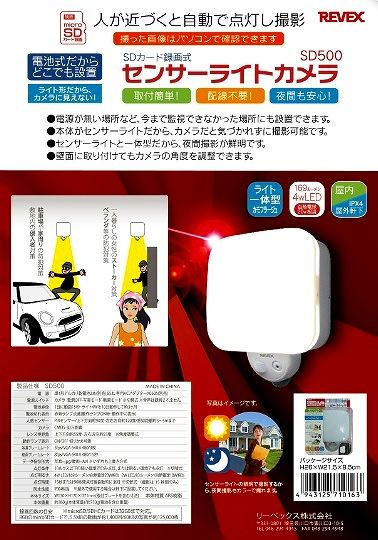リーベックス/REVEX センサーライトカメラ SDカード録画式 SD-500 りーべっくす 防犯カメラ 防犯グッズ 安心 安全 セキュリティ 不法投棄 侵入者 車上荒らし 農作物荒らし 人感センサー 電池式 ライト付き センサーライトカメラ 防犯機器 安全機器 ノベルティ・ギフト用品