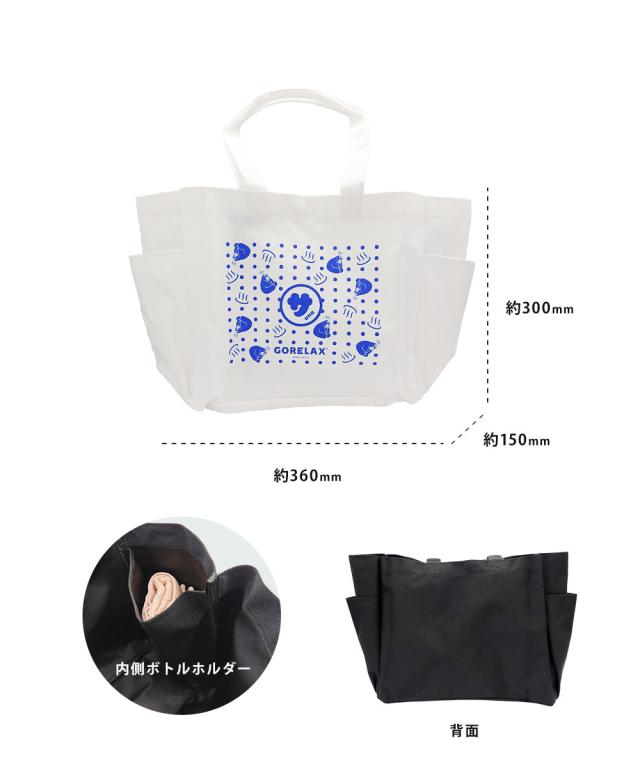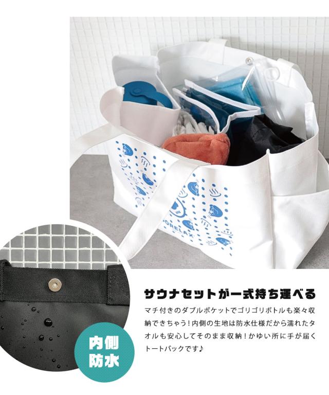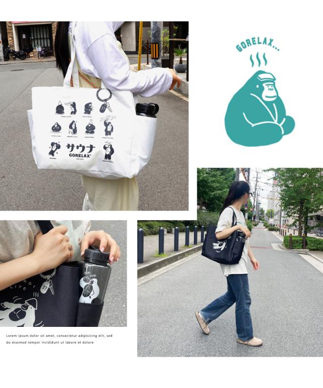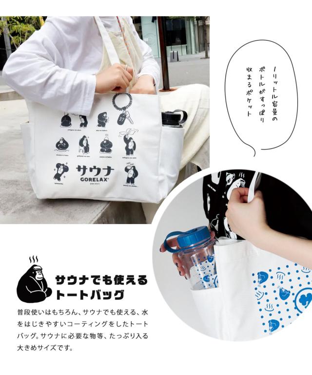 トートバッグ 大きめ 防水 撥水 コーティング サウナ サ活 レディース メンズ 大容量 a4 カジュアル キャンプ アウトドア 通勤 通学 ごりら キャラクター ロゴ 白 黒 ボトルホルダー ごリラックス ととのいトート ホワイト ブラック