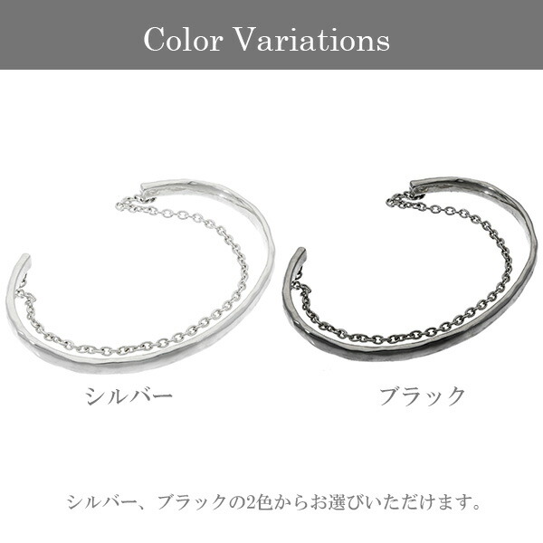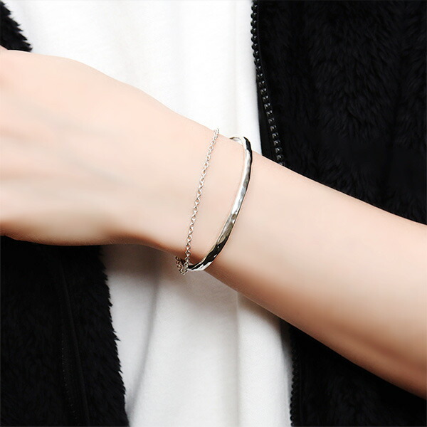 自然を思わせるランダムな槌目仕上げのバングルと、無機質なチェーンの組合わせが秀逸な2連ブレスレット。