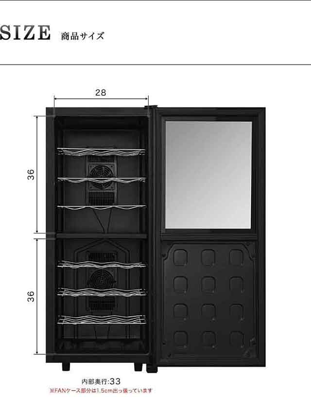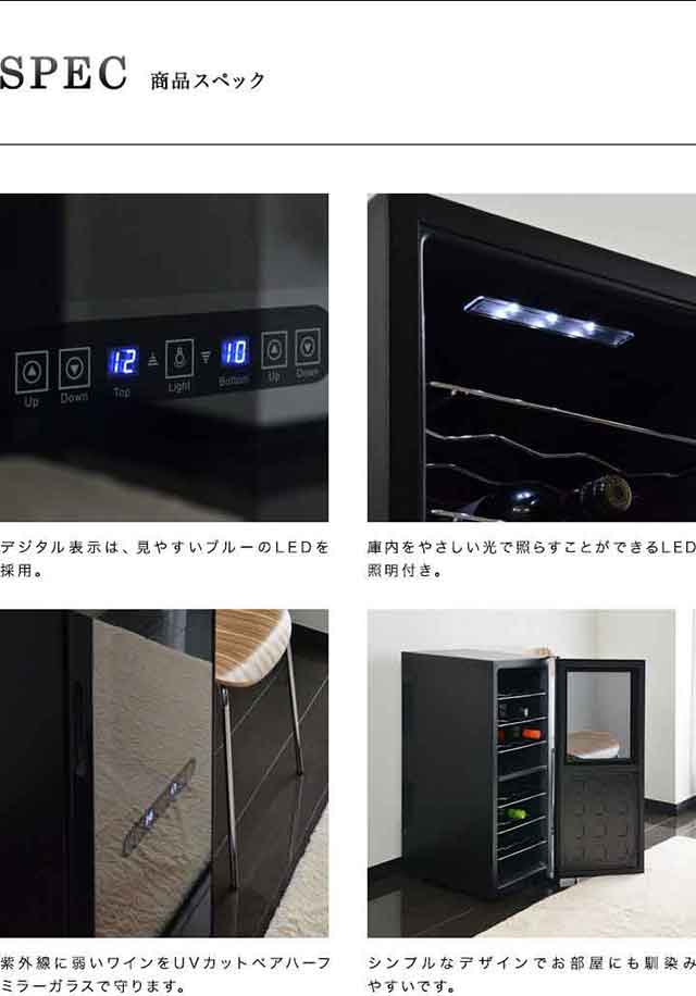 ・太めのワイン(シャンパンボトルやブルゴーニュワインなど)はフリースペースにお入れください。 ・こちらの商品 はヒーターレスモデルのため、外気が庫内設定温度より低い場合、庫内温度が外気温に近づく傾向がございます。設置いただく環境を予めご確認ください。 ・ワインセラーの設置場所は温度変化の少ない場所へ設置願います。 ・室温が25以上や12度以下になった場合は温度調節が正しく作動しない場合があります。 ・加湿/加温機能はございません。 ・庫内温度の上昇によりワインに変質があっても保証致しかねます。庫内温度には充分ご注意ください。 |