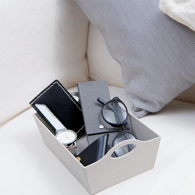紙製ボックスのようなあたたかみを感じるお洒落な風合いと、シックで落ち着いた色がお部屋に馴染みやすい浅型のミニバスケットです。プラスチック製なので水や湿気に強くキッチンやバスルームでも活躍してくれます。