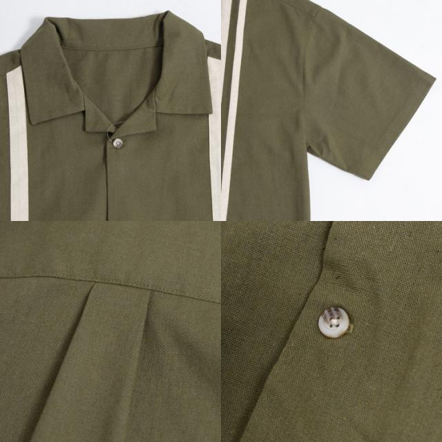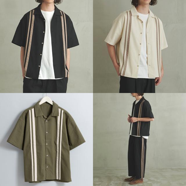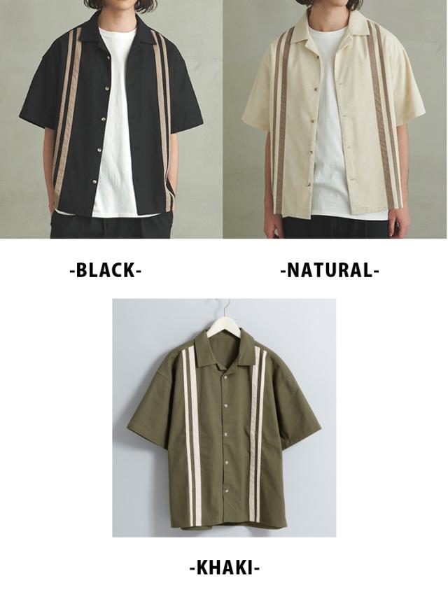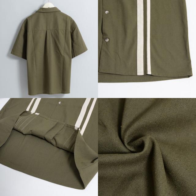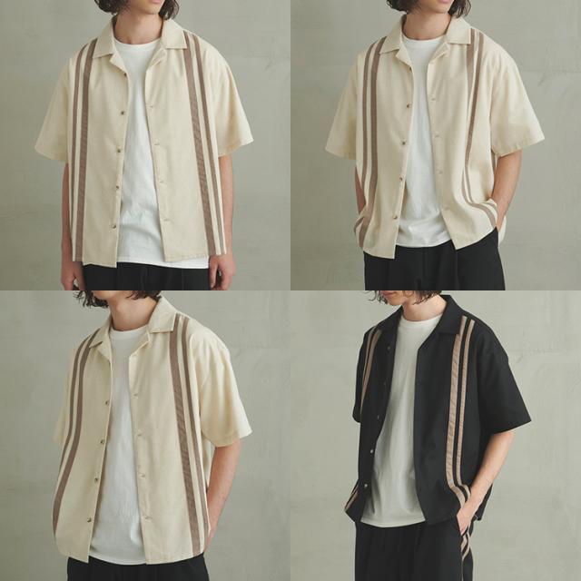フロントに施されたラインデザインがヴィンテージライクな雰囲気の半袖シャツ。着こなしに抜け感と涼しげな印象を与えるオープンカラー仕様。オーバーサイズシルエットでさらにリラクシーな雰囲気に。ただの大きいサイズではなく、バランスの取れた身幅と丈感でちょうどよいオーバーサイズ感をお楽しみ頂けます。ボディには、テトロンと呼ばれるポリエステルとレーヨンを合わせたTR生地にリネンをブレンドした混紡素材を使用。リネン特有のナチュラルな風合いと清涼感に加え、合繊の程よい落ち感も加わった魅力的な風合いに仕上がっています。ドライタッチな肌触りで蒸し暑い夏場に最適な質感で着心地も抜群です。ブラック、ナチュラル、カーキの3色展開。スラックス、革靴などと合わせてアダルトな雰囲気に、スノーパンツやカーゴパンツ、バギーデニムパンツなどと合わせればトレンド感溢れるストリートコーデに仕上がります。これからの季節にはショートパンツやイージーパンツと合わせたリラックスした夏の装いもおすすめです。同生地でワイドパンツも展開しているので、夏のセットアップスタイルもお楽しみ頂けます。