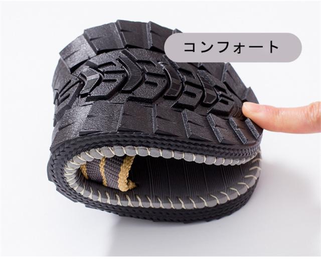 溝がたくさん入っていて、防滑性抜群だけでなく、通気性を確保し、 足への粘りを減らす。