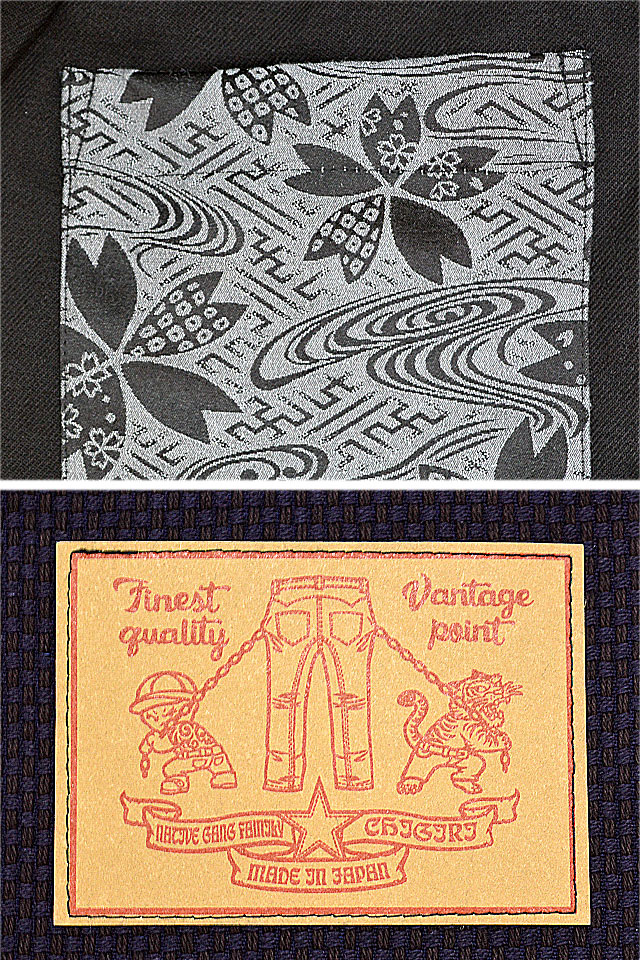 内もも部分、バック右ポケットにはインディゴ刺子生地を合わせ、バック左ポケットなどに和柄生地を配しました。