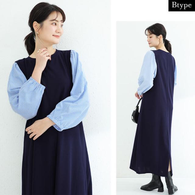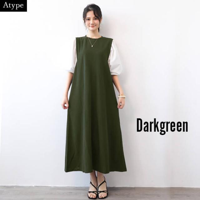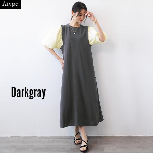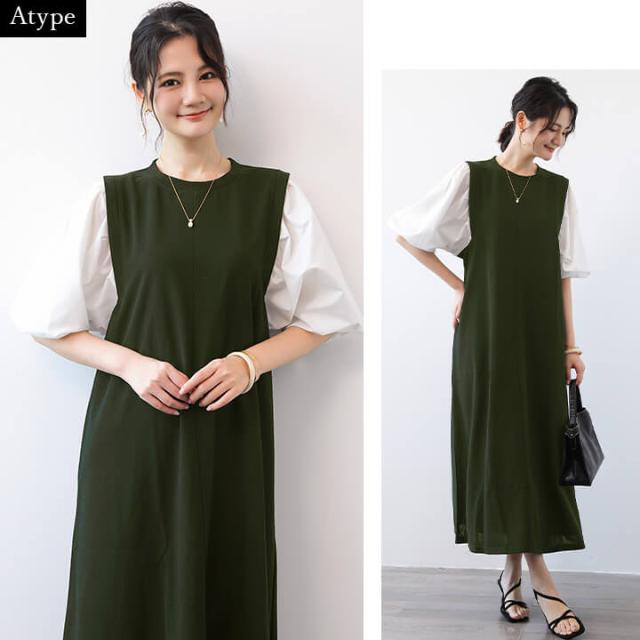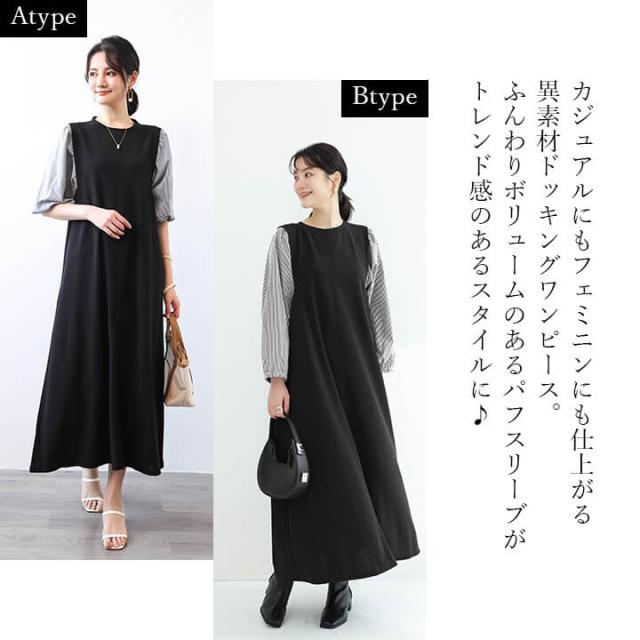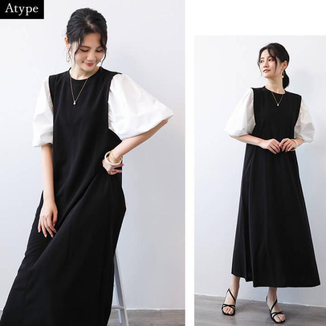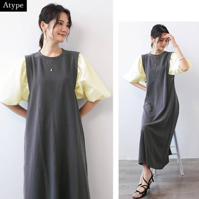ワンピース レディース カジュアル ロングワンピース ロング丈 同窓会 二次会 食事会 膝下丈 膝下 フェミニン 異素材 ドッキングワンピース パフスリーブ トレンド感 10代 20代 30代 春 きれいめ ロング 体型カバー ゆったり 大きいサイズ ラウンドネック