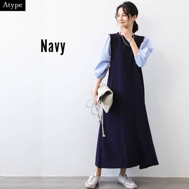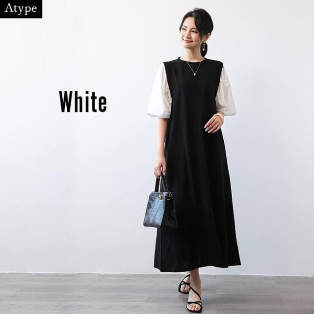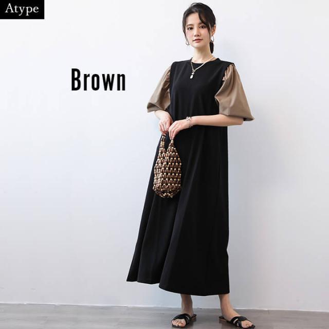 ワンピース レディース カジュアル ロングワンピース ロング丈 同窓会 二次会 食事会 膝下丈 膝下 フェミニン 異素材 ドッキングワンピース パフスリーブ トレンド感 10代 20代 30代 春 きれいめ ロング 体型カバー ゆったり 大きいサイズ ラウンドネック バックスリット 黒 茶色 紺色 白 ブラック ブラウン ネイビー ホワイト M L 9号 11号 rt3420