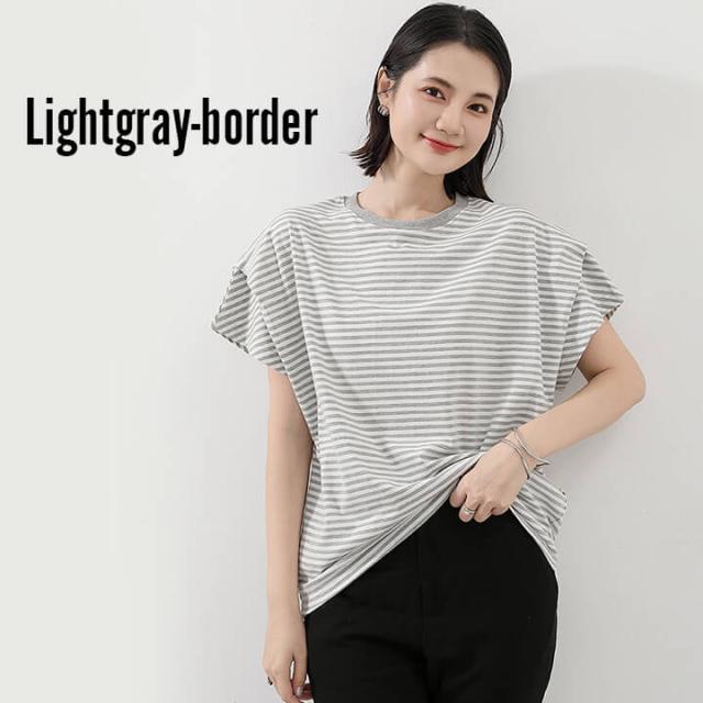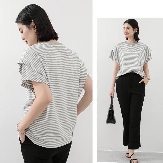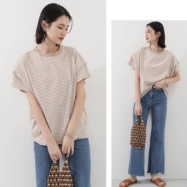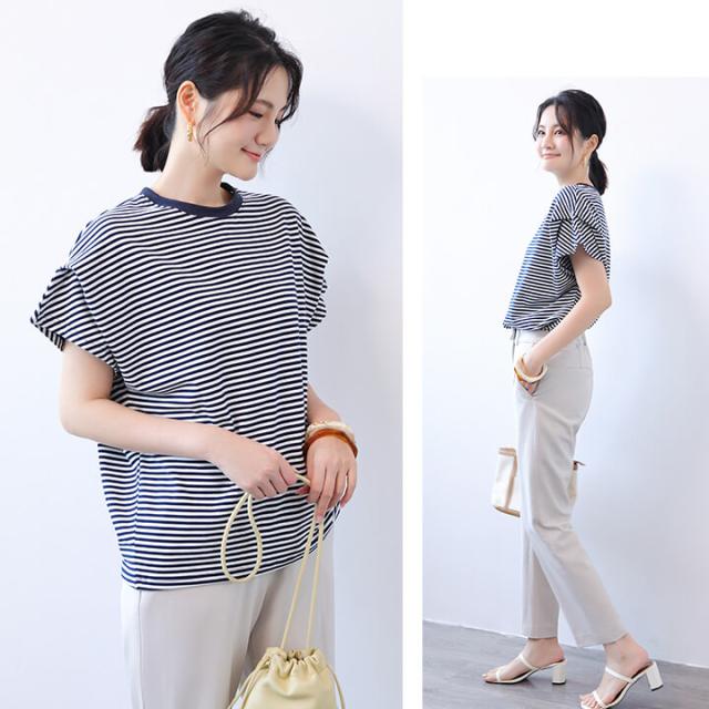 夏新作 Tシャツ トップス レディース 半袖 フレンチスリーブ ボーダー ゆったり フリーサイズ ラウンドネック クルーネック Uネック 女性 カジュアル オフィス ゆったり 大きめ シンプル 夏 春 タック シャツ 大人 袖あり オフィスカジュアル