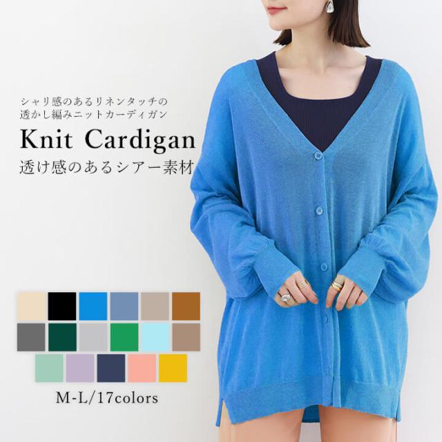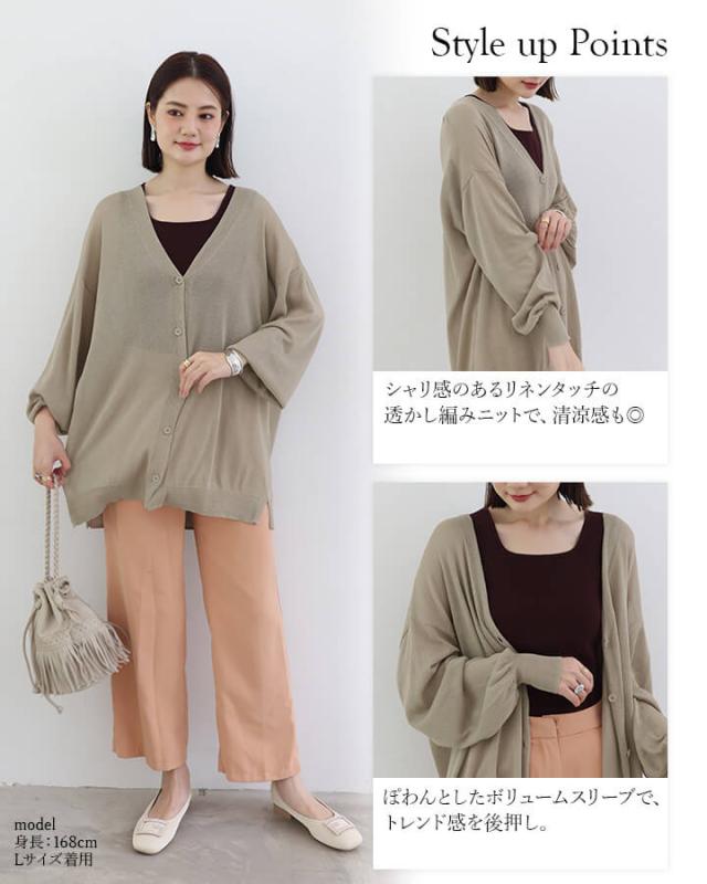 ニットカーディガン ニット カーディガン 20代 30代 40代 透け感 シアー素材 シャリ感 リネンタッチ 透かし編み 涼しい 清涼感 ぽわん ボリュームスリーブ トレンド ゆったり シンプル ロングシーズン 着回し スリット 抜け感 さりげない 大人 ママ カジュアル レディース ベージュ 肌色 ブラック 黒 ブラウン 茶 グレー 灰 グリーン 緑 ライトグリーン ライトパープル 紫 ネイビー 紺 藍 袖あり 長袖 tops29 フリーサイズ F