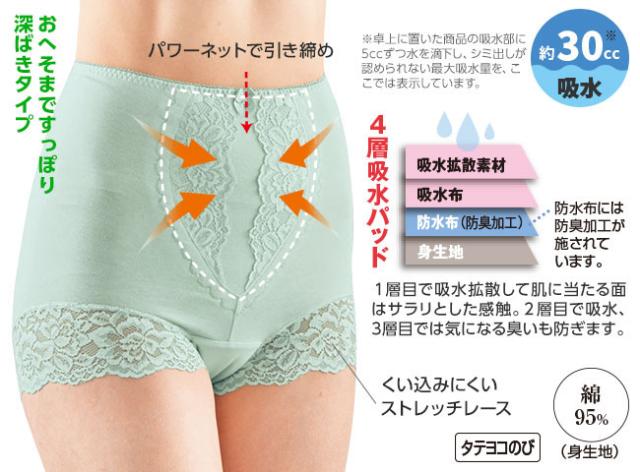 軽い尿モレを約30cc吸収。ポッコリお腹もカバーする、深ばきタイプのオシャレなレースショーツ。4層構造で尿モレケアとお腹の引き締めに。
