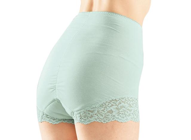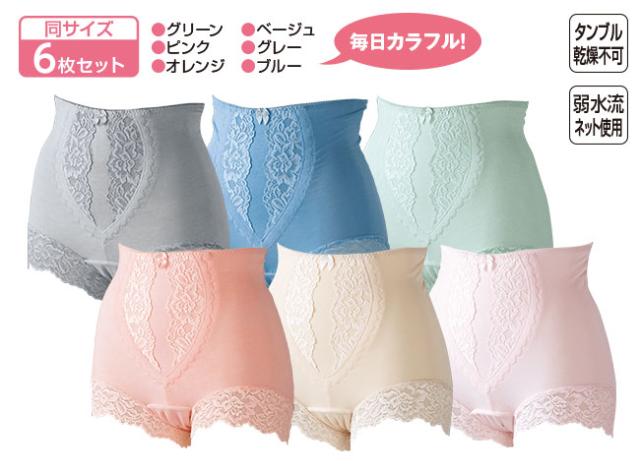 快適に過ごせるよう、尿モレ対策を。パワーネットで下腹を押さえてシルエットを整えるオシャレなレースショーツ。お腹と腰まわりをすっぽりと包む深ばきタイプなので冷えにくく、タテにもヨコにも伸びて着心地ラクチン。そして軽い尿モレが気になる方の為に、中心部には約30cc吸水の4層構造のパッドを採用。オレンジ・ピンク・グリーンなど、気分まで華やぐ6色を揃えました。洗い替えにも便利なお買い得セットです。