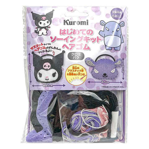 ストア内の商品は全品送料無料です。用意するものなし! 届いたらすぐに作れる!「クロミ&バク」のマスコットタイプのヘアゴムが作れる「ソーイングキット」です。付属のプラスチック針と糸を使って、順番通りに布を縫い合わせます。布には、あらかじめ縫い穴があるので、初めての方でも簡単です。ヘアゴムパーツをお好みでヘアピン(付属しません)などにアレンジしても。【セット内容】布、プラスチック針、ヘアゴム、縫い糸、綿【完成サイズ】クロミ=約W85×H80mm 、バク=約W90×H50mm (ゴム部分を含めず)【材 質】布・糸=ポリエステル、縫い針=ABS【対象年齢】6歳以上※こちらの商品は手作り材料セットで、完成品ではありません。■メーカー: 尾上萬