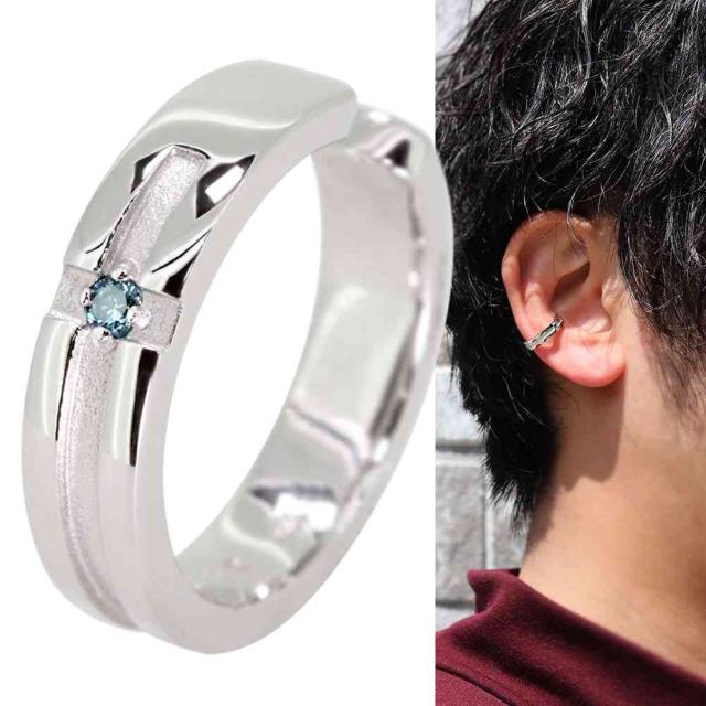 ブルーダイヤモンドを使用したシルバー製の、クロス(十字架)モチーフのメンズイヤーカフです。