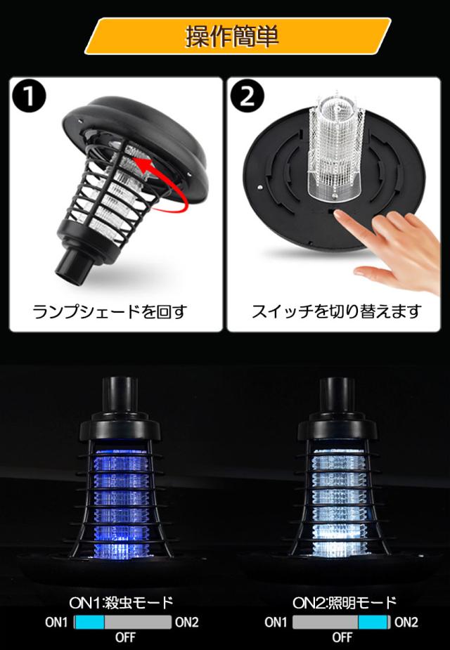 【一台二役:強力蚊除け&照明ランプ】薬剤を使わず、蚊が好む光に集まる習性を利用して、紫外線ライトで誘導。蚊などが内側の高圧電撃ネットに触れると瞬時に感電死させます。