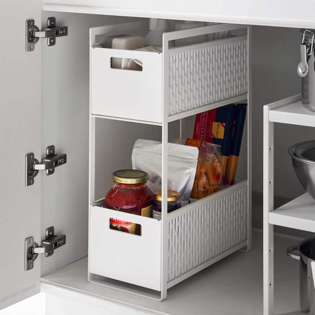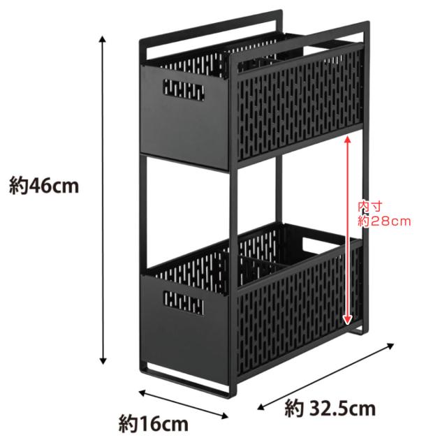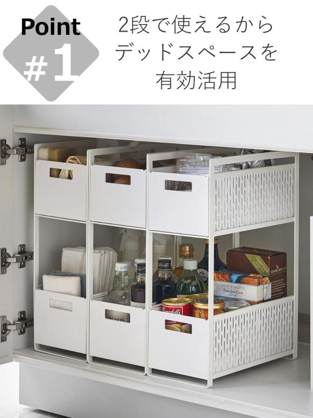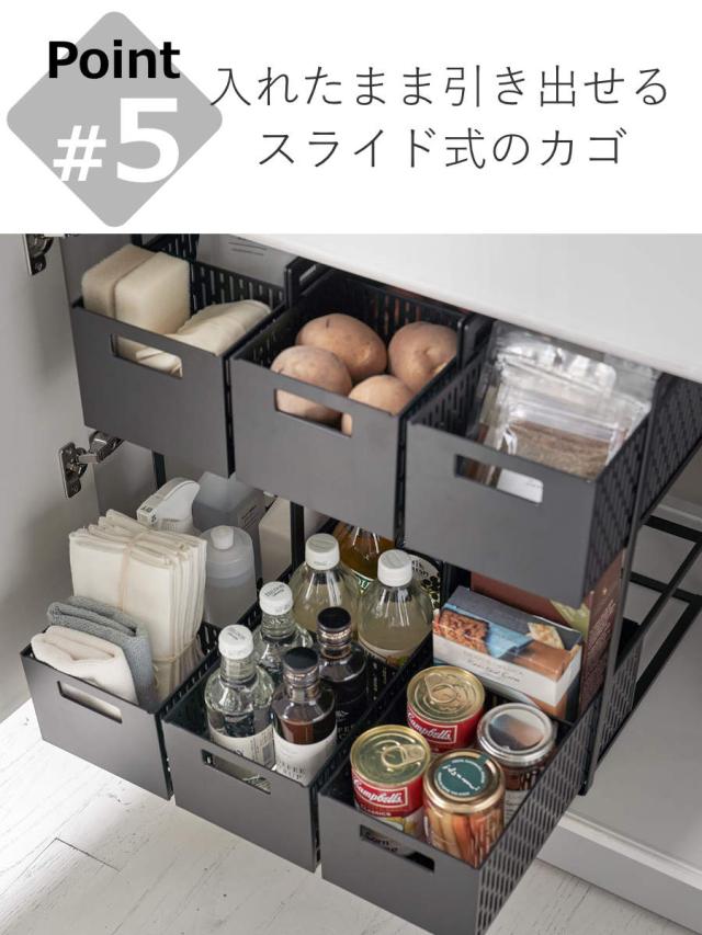 扉タイプのシンク下空間を有効活用できる、スライド式のバスケット2段タイプです。スパイス・缶詰・レトルト食品・掃除道具などのストックにちょうど良いサイズ感です。背の高い調味料・洗剤・ペットボトルなどの収納にもお使いいただけます。