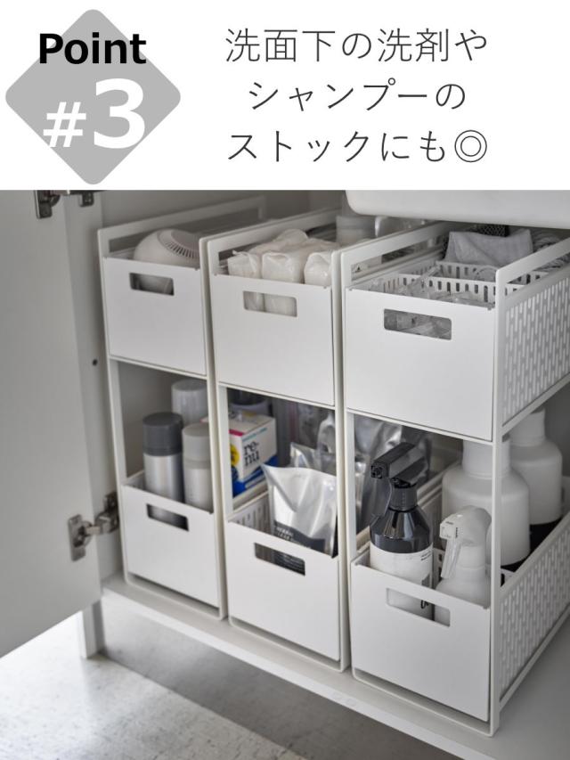 洗面台下のラックとしてドライヤー収納や洗剤・掃除道具などのストックにもピッタリです。