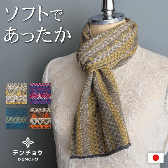 デンチョウ 【ふわふわ】ストライプ幾何学柄 マフラー ストール 冬 レディース メンズ スヌード グッズ 洗える プレゼント ギフト 日本製 薄手 肌に優しい 敏感肌 あったか 暖かい おしゃれ 無地 防寒 ニット 還暦 古希祝 誕生日