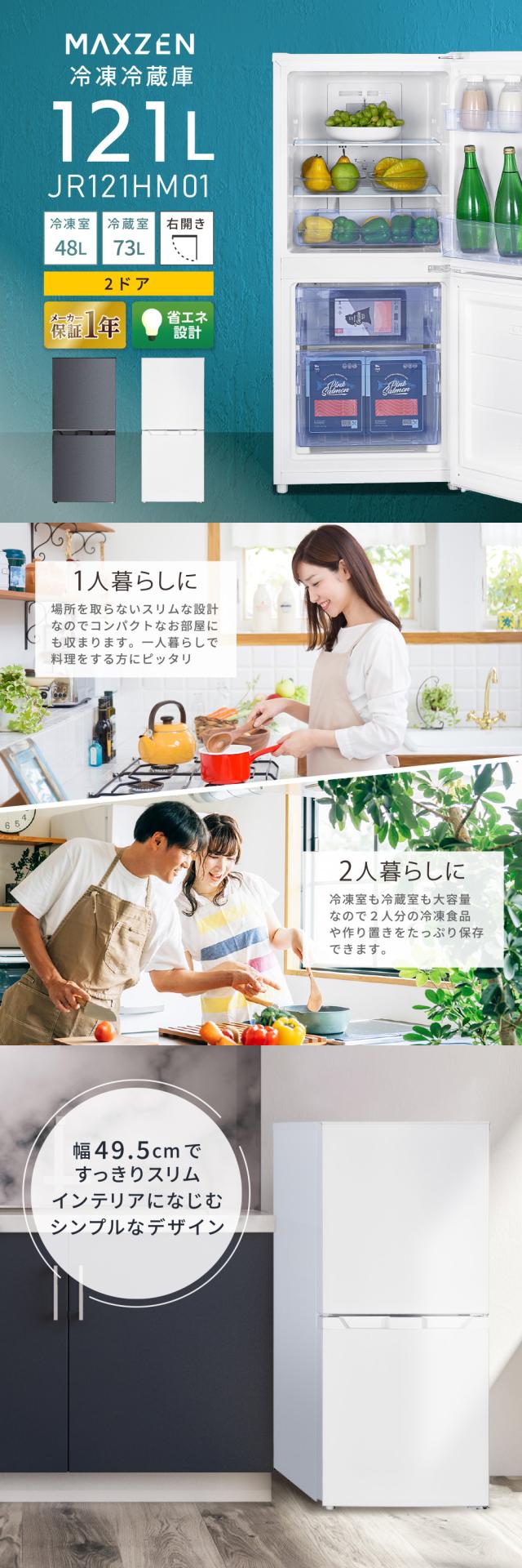 冷蔵庫 121L 自動霜取り コンパクト 大容量 右開き 2ドア 幅50cm 一人暮らし 二人暮らし 冷凍室下側 温度調節 耐熱板 省スペース 白 ホワイト JR121HM01 マクスゼン