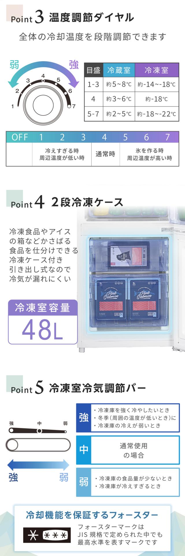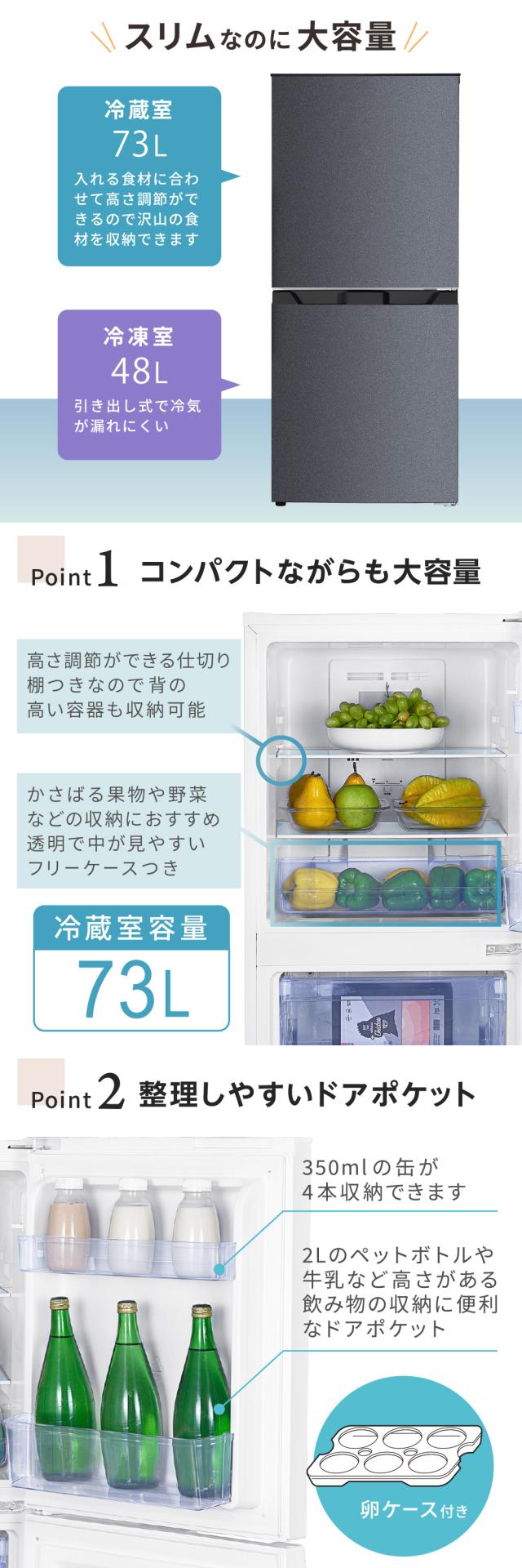 * 定格内容積:121L(冷蔵室:73L、冷凍室:48L)