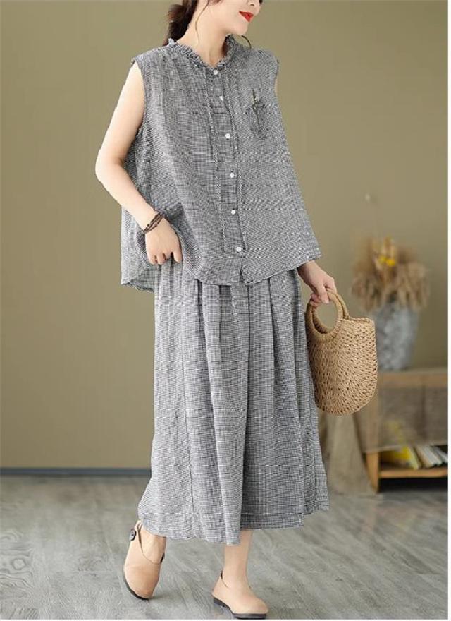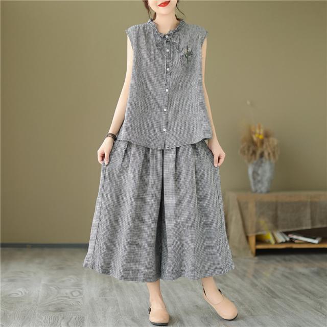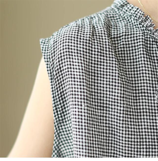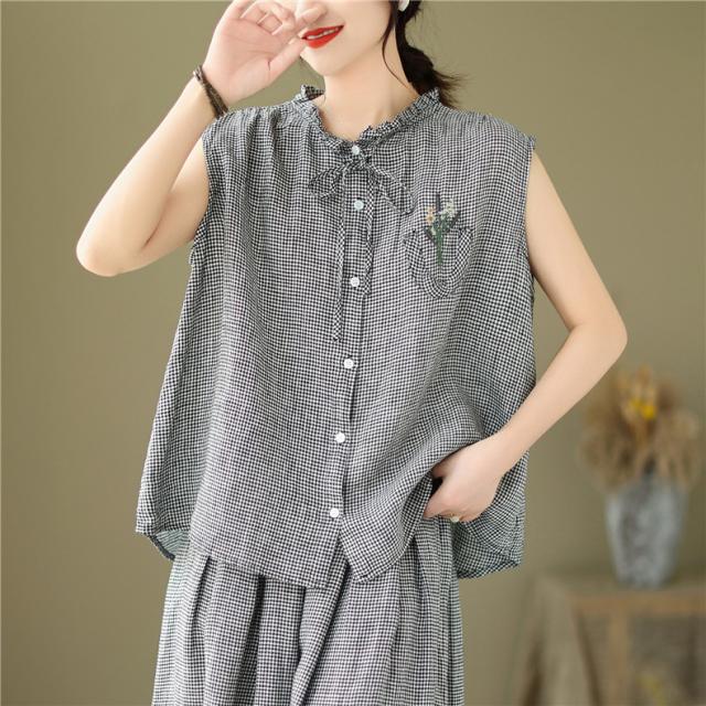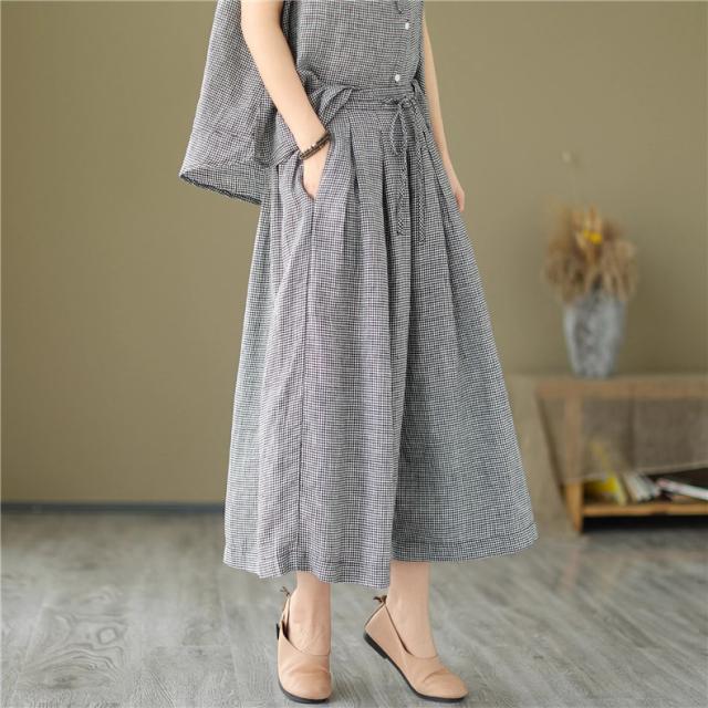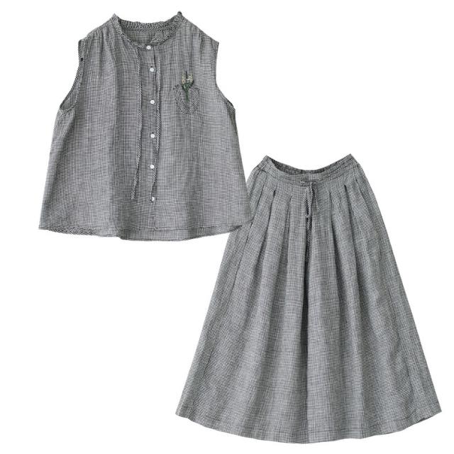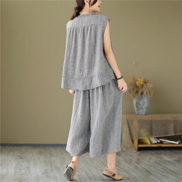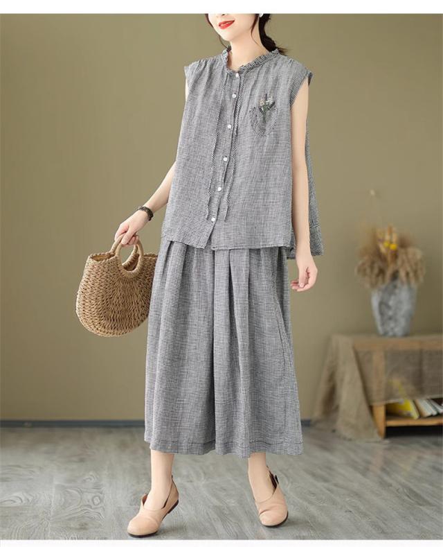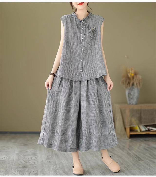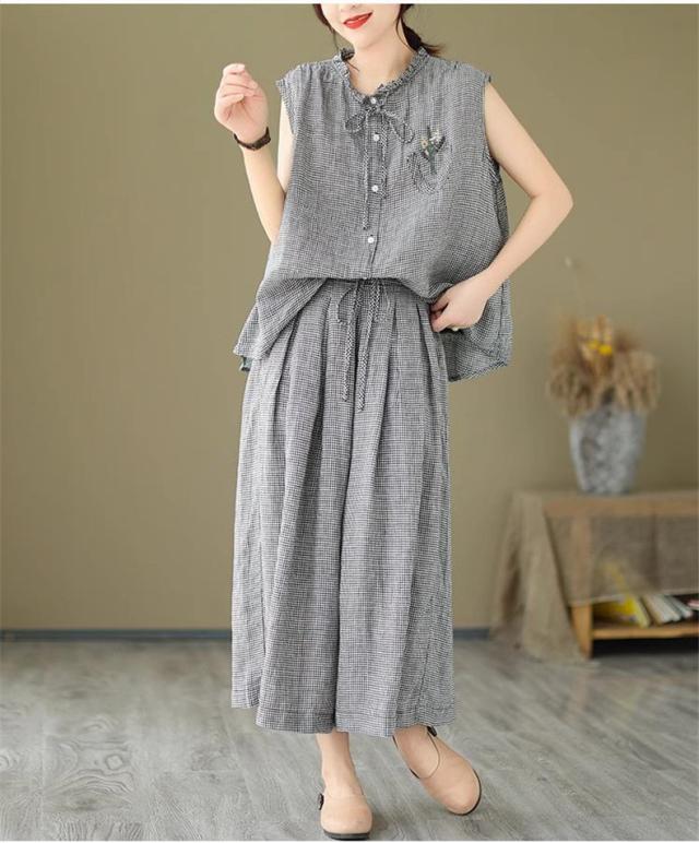 セットアップ コットン レディース 夏 上下セット ワイドパンツ+ノースリーブシャツ 大人 チェック柄 2点セット 派手すぎないきれいめ