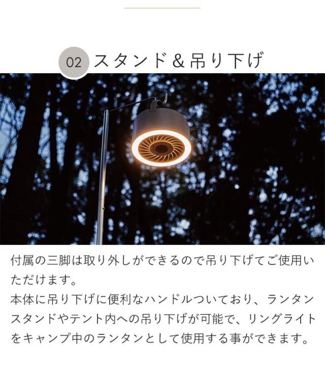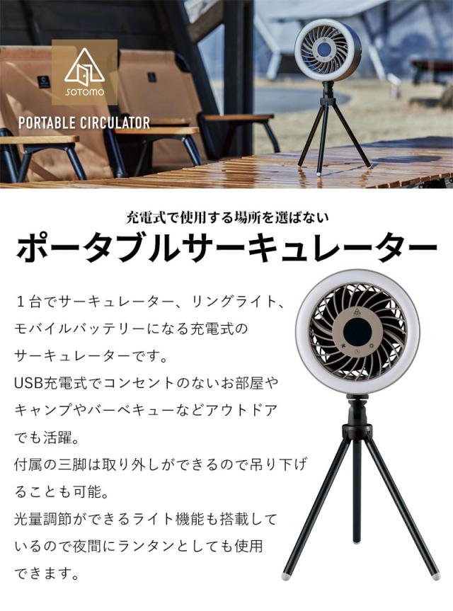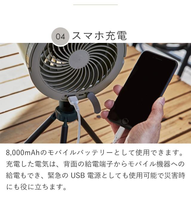 | 三脚が取り外し可能で吊り下げ使用できるポータブルサーキュレーター。 充電式なのでコンセントのないお部屋やキャンプやバーベキューなどアウトドアでも活躍するコンパクトなサーキュレーターです。 8,000mAhのモバイルバッテリーとして使用可能。 付属の三脚は取り外しができるので吊り下げることもできます。 光量調節ができるライト機能も搭載しているので夜間にランタンとしてもお使いいただけます。 |