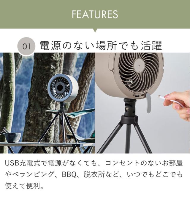充電式なのでコンセントのないお部屋やキャンプやバーベキューなどアウトドアでも活躍するコンパクトなサーキュレーターです。