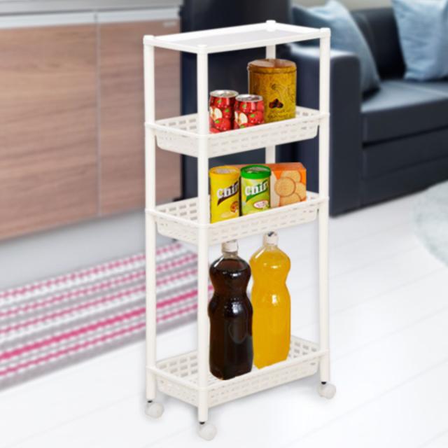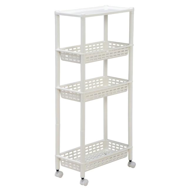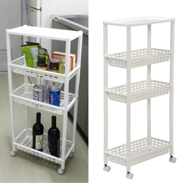 散らかる小物やストック類などをすっきりと整頓できる、樹脂製の4段ワゴンです。軽量シンプルで小回りのきくスリムワゴンなので、キッチンや洗面所などの狭い空間でも使いやすく、ちょっとした隙間にもフィットしスペースを有効活用できます。