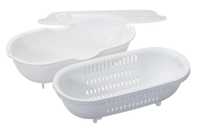 トウモロコシやサツマイモの調理だけでなく、下ごしらえした食材の一時置きや水切り、野菜などを水にさらす時にも使えます。水切りはフタをしたままできるので食材がこぼれ落ちる心配がありません。