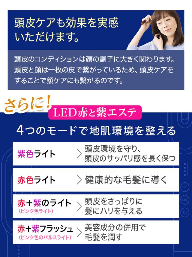 | モード | 【モード:期待される効果】 ●紫色ライト:頭皮環境のバランスを守り、頭皮のサッパリ感を長く保つ。 ●赤色ライト:毛包の活力を補う。健康な毛包を取り戻す。 ●赤+紫ライト(ピンク色ライト):頭皮をさっぱりに。髪質を豊かにする。 ●赤+紫フラッシュ(ピンク色のパルスライト):栄養の補給を促進する。毛包を潤す。 ※育毛剤・美容液の吸収を強化するため、育毛剤・美容液の使用後にLEDライトを単独で使用することも可能です。 |