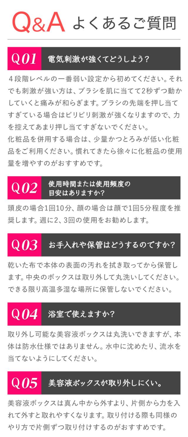 【危険】 ●同梱の充電ケーブルを使用して、充電器を家庭用コンセントを正しく接続してください。故障、発火、または発熱による火災の原因になります。 ●製品の変形、破損、異臭が発生した場合は、使用しないでください。感電や火災の原因になります。 ●心臓手術を受けたことがある方、ペースメーカー、埋め込み式除細動器などの医療用電子機器を装着している方は使用しないでください。 【警告】 ●危険を防ぐため、医療用電子機器と併用しないでください。 ●衛生上の理由から、他人と共用しないことをお勧めします。 ●櫛の歯を下向きにして垂直に置かないでください。液漏れの原因になります。 ●初めて使用する方や敏感肌の方は、事前にお肌の状態を確認してからお使いください。 ●ご使用前に、電極櫛歯を必ず確認してください。変形、割れ、汚れがある場合は、使用しないでください。 ●水の入った浴槽、シャワー、洗面台、その他の容器の近くでは使用しないでください。 ●皮膚に明らかなトラブル(メラノーマ、基底細胞ガン、日光角化症、全身性エリテマトーデス、ポルフィリン症、凝血異常、ケロイド、肥厚性瘢痕、創傷治癒遅延などのコラーゲン異常など)がある場合は、ご使用前に医師に相談してください。 ●血液の流れに影響を与えるため、ケア終了後すぐに軽度の赤みが表れる場合があります。ケア中に発熱やしびれを感じることがあります。これらの反応は通常、数分で消えます。24時間経過しても皮膚反応が消えない場合は、医師に相談してください。 ●以下の場合は、ご使用前に必ず医師に相談してください。 ※皮膚症状が現れている、または皮膚に影響を及ぼす可能性がある場合。 ※熱を感じる感覚に影響が現れた場合。 ※直近に頭部の手術、美容治療を受けた場合。 ※皮膚、熱感知力、細かい運動技能に影響を及ぼす可能性のある薬剤を服用した場合。 ●皮膚や体に違和感を感じた場合は、すぐに使用を中止してください。 ●本製品は、身体の弱い方に適していません。医師の指導のもと、ご使用ください。 ●幼児のご使用は禁止されています。子どもの手の届かない場所に保管してください。 ●使用時に製品が異常に発熱した場合、直ちに使用を停止し、電源を切ってください。火傷または火災の原因になります。 ●破損した充電器がしっかりと差し込めないコンセントは使用しないでください。感電、ショート、発火などの原因になります。 ●アルコール、ガソリン、スプレーなどの燃えやすい物の近くでは使用しないでください。火災や爆発の原因になります。 ●掃除やお手入れをする前に、電源を切って電源プラグは抜いてください。 ●本製品を規定以外の用途に使用しないでください。故障や火災の原因になります。 ●この製品は防水ではありませんので、水に浸したり、水で洗ったりしないでください。 ●環境温度15℃〜30℃の範囲で使用してください。 ●5℃〜35℃の環境温度で充電・保管してください。 ●湿気の多い環境で保管しないでください。 |