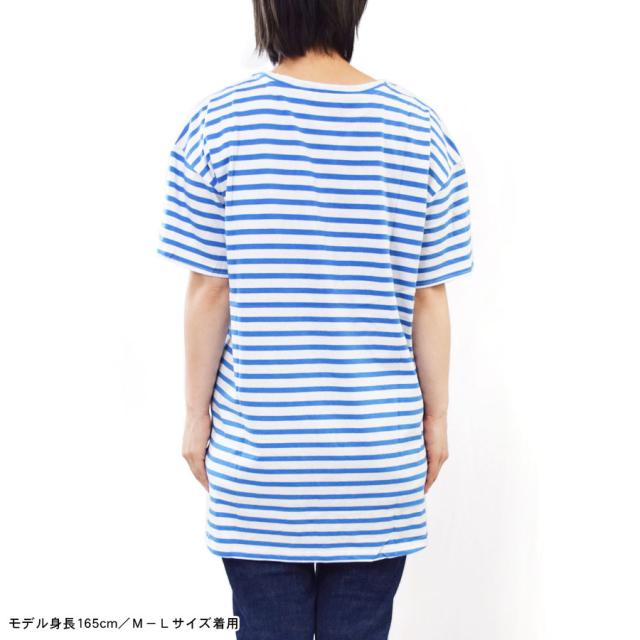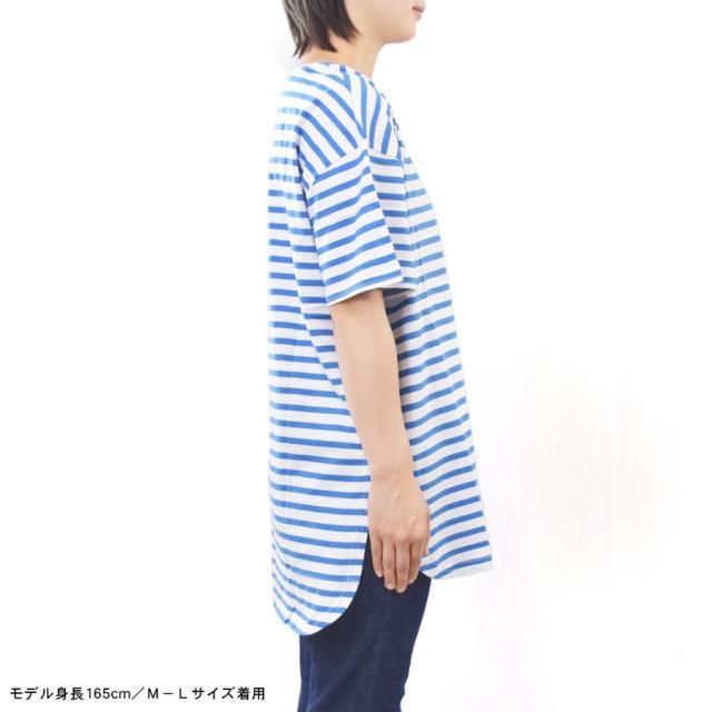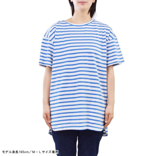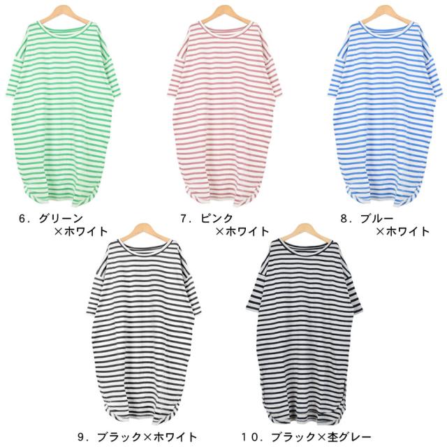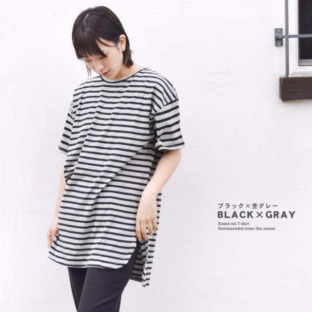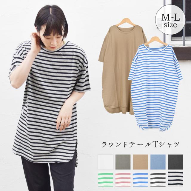 【Tシャツ カットソー トップス レディース 半袖 ロング丈 コットン 綿 ラウンドテール 前後丈違い ロングTシャツ ボーダー 無地 BIG ゆったり 大きめ ワイド 丸首 クルーネック 薄手 サイドスリット 体型カバー マタニティ】