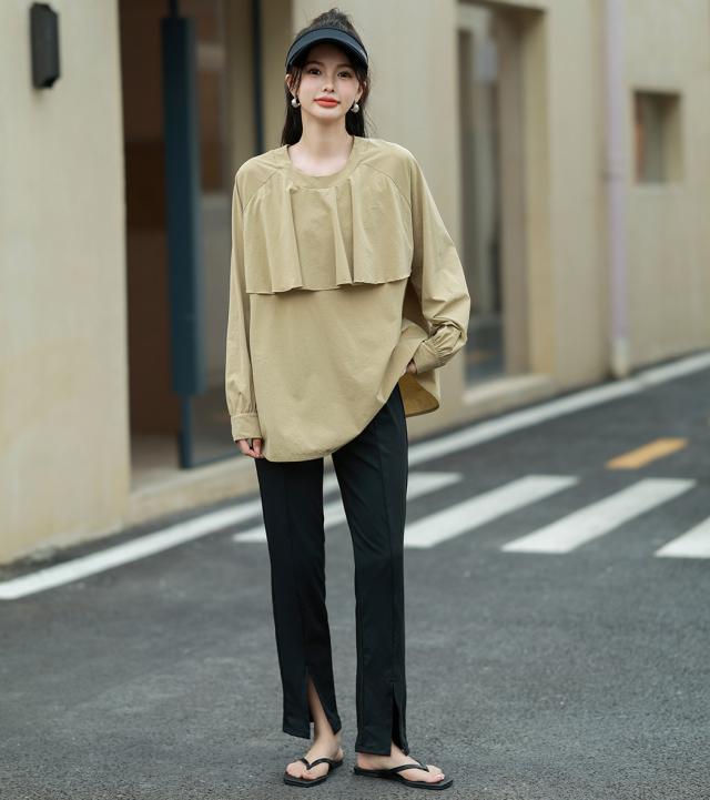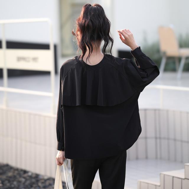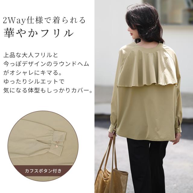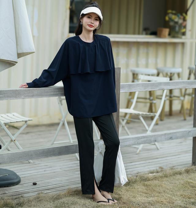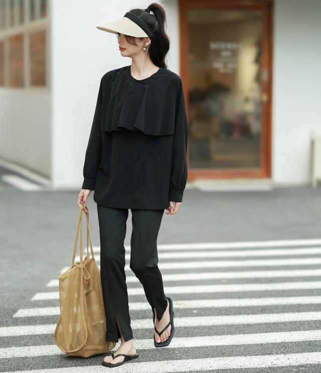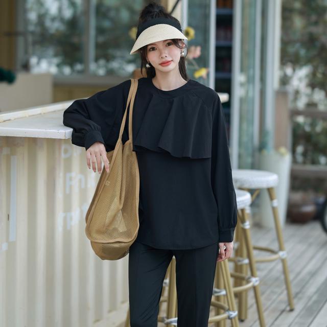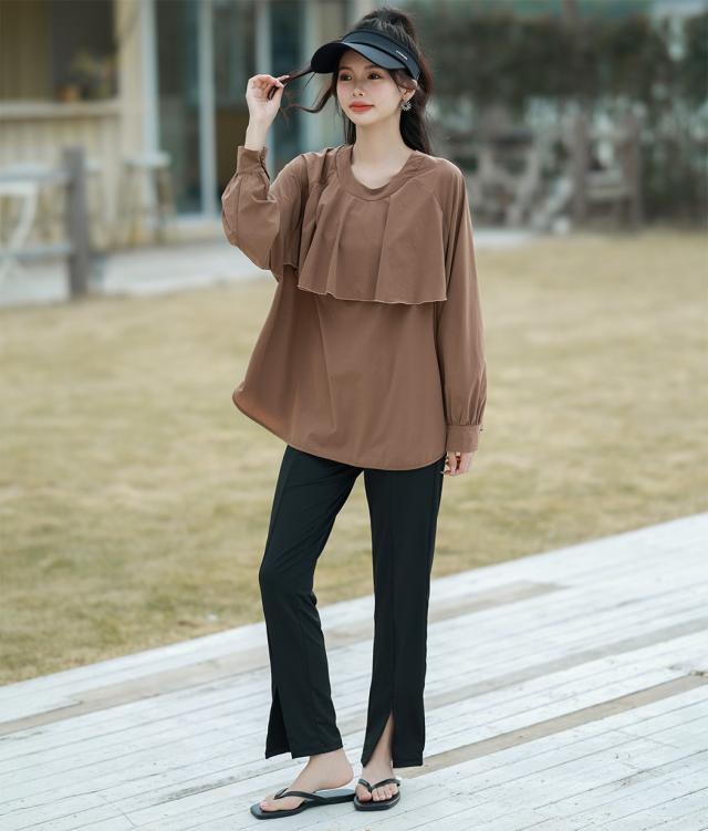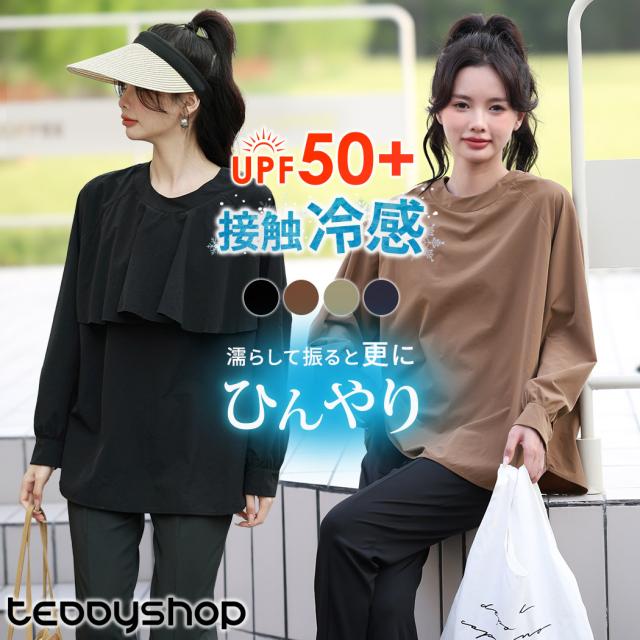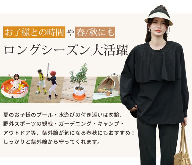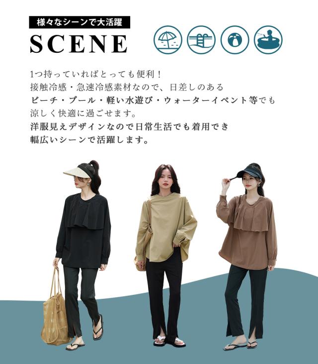 春新作 ラッシュガード レディース 長袖 上下セット UPF50+ 接触冷感 水陸両用 水着 体型カバー おしゃれ かわいい 日焼け防止 スリットレギンス付き 2点セットアップ ゆったり 前後 2WAY フリル 薄手 黒 二の腕 ヒップ 太もも 脚 カバーアップ フードなし