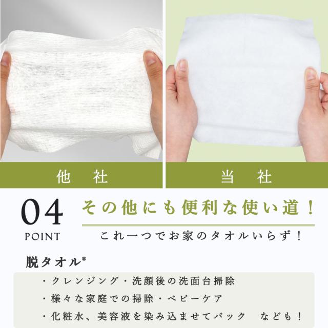 使用例:クレンジング、洗顔後の拭き取り、汗の拭き取り、ベビーケア、掃除、ネイルオフ、防災用。