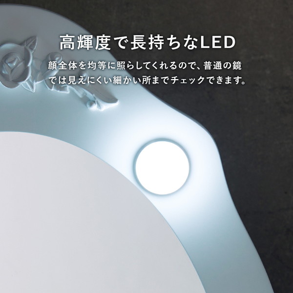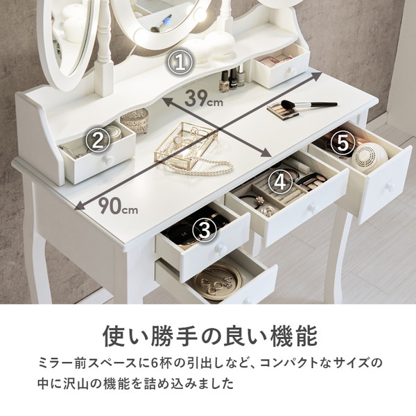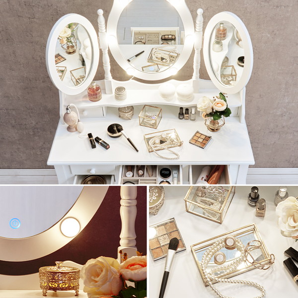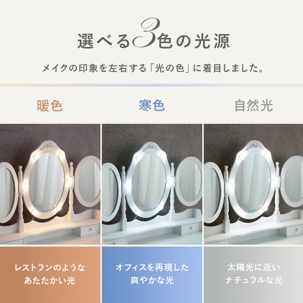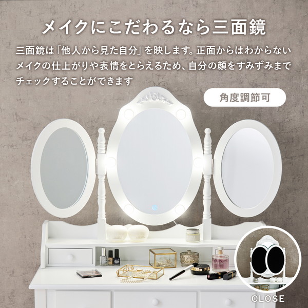 LEDの女優ライト付きのドレッサー。いろいろな角度からメイクやヘアスタイルを確認できる楕円形の三面鏡タイプ。上品な曲線脚のデザインを合わせたスツール付き