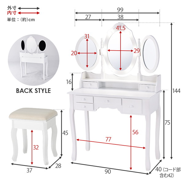 ■サイズ(約)ドレッサー:幅90×奥行42×高さ144cm、スツール:幅37×奥行28×高さ45cm