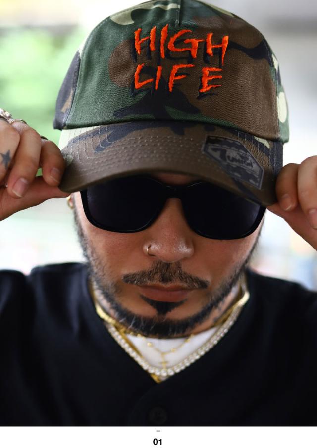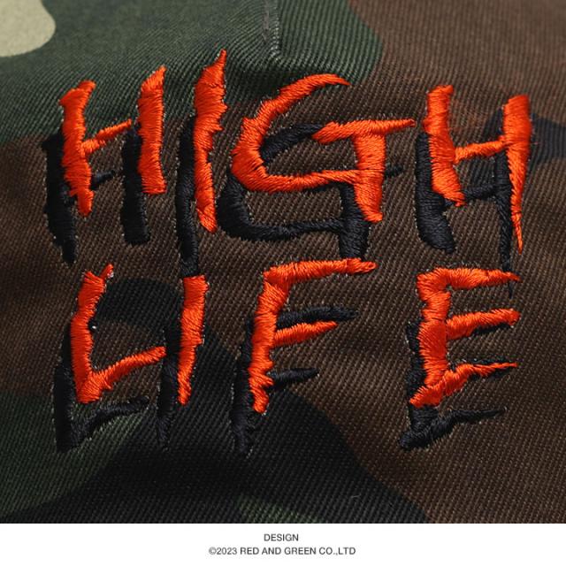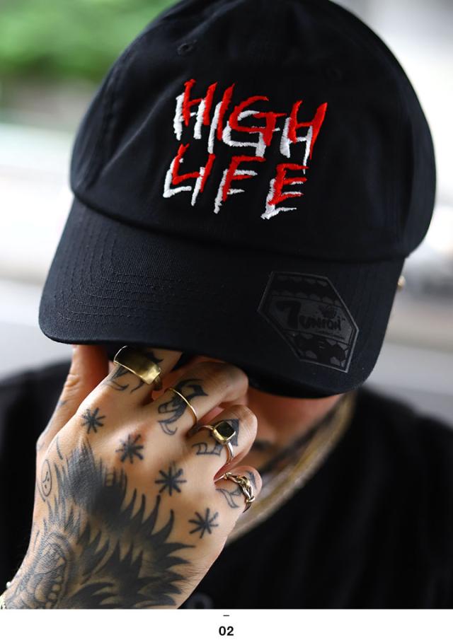優雅な生活を意味するテキストロゴの「HIGH LIFE」ロゴをノイズに影をつけた特殊な刺繍でレイアウトしたスタイリッシュな仕上がり。
