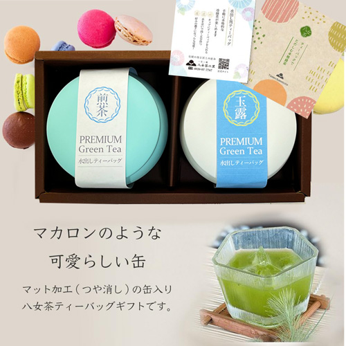 マット加工(つや消し)のマカロンの様なかわいらしい缶にそれぞれティーバッグが入った八女茶ティーバッグギフト