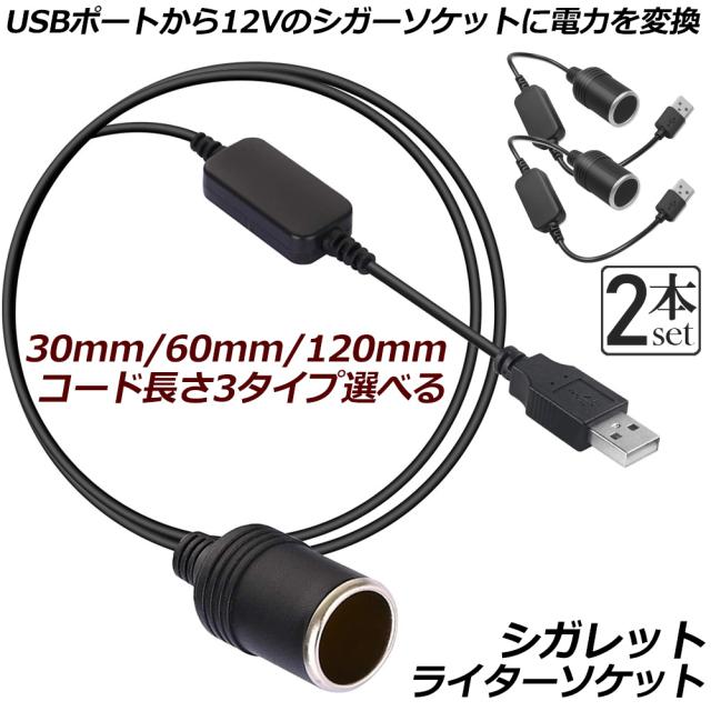 【USBポート電力変換器】USBポートから12Vのシガレットライターソケットに電力を変換します。【商品仕様】ケーブル長さ:30cm/60cm/120cm三種類からお選べいただけます。