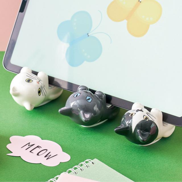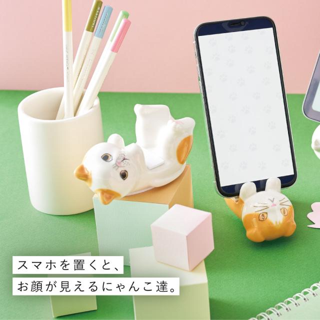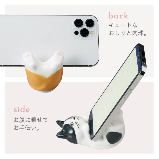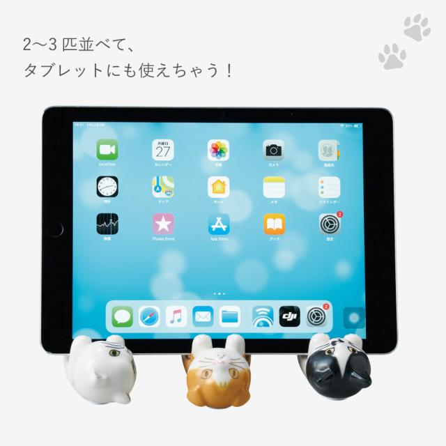 可愛く転がったにゃんこの上にスマホを乗せて癒される、便利なスマホスタンド。スマホを置くと、動画などを見ている間にも、こちらをじっと見るにゃんこたち。可愛いお顔が見える構造なので置くのが楽しくなります。