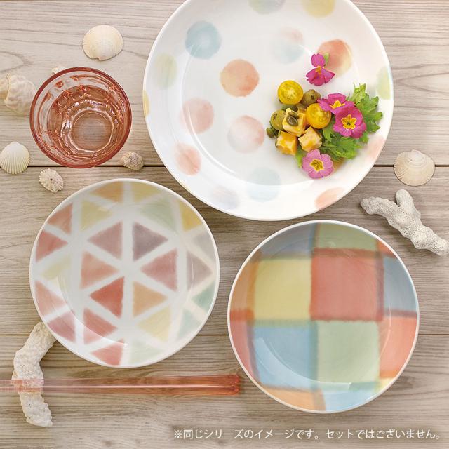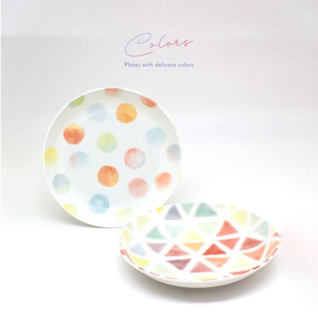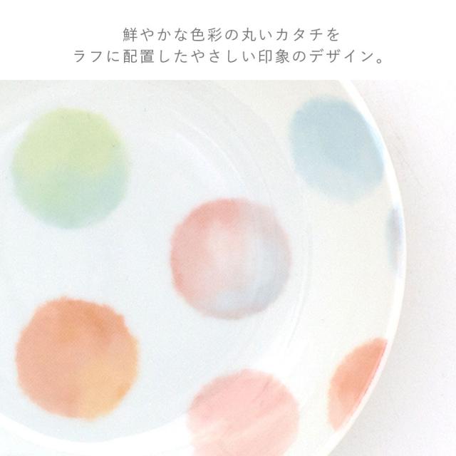 丸いカタチが織りなす、さわやかな印象のテーブルウェアシリーズ「カラーズ」のパーソナルセット。繊細な色彩で描かれた丸い柄は、ぼんやりと滲みながら美しく広がります。