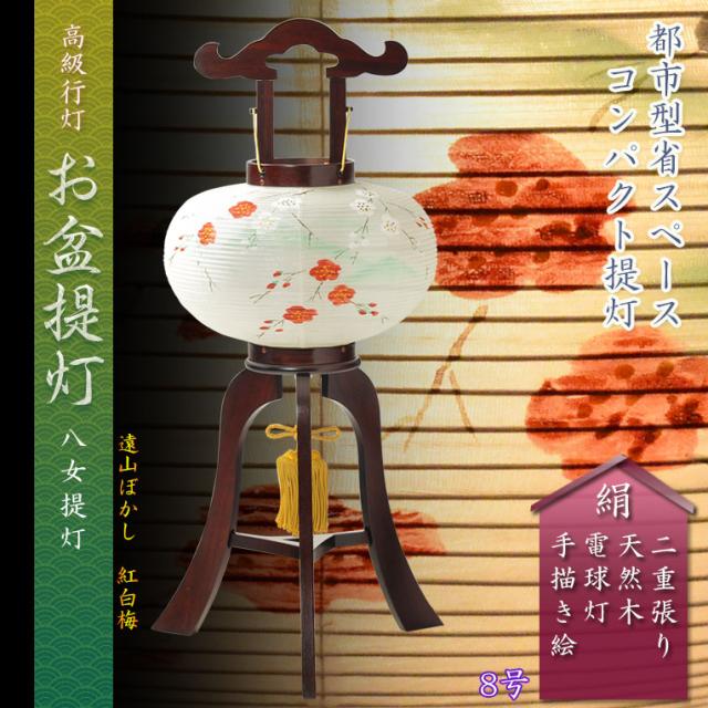 特選 高級盆提灯【八女提灯:コンパクトサイズ・天然木・絹二重張り・電球灯 8号 紅白梅】盆ちょうちん 行灯 盆用品 お盆飾り 新年 正月 賀正 送料無料